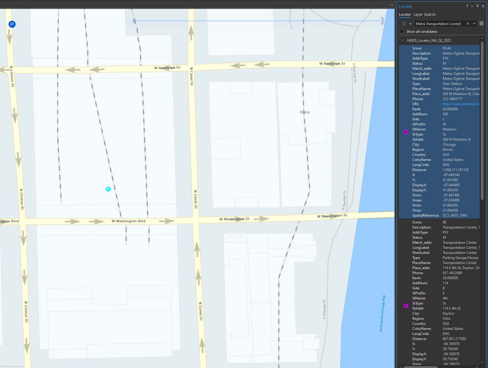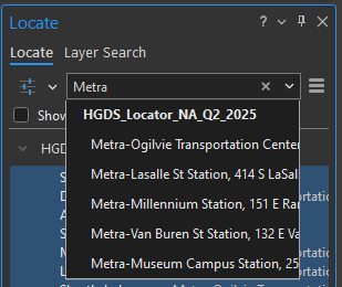 Locators support suggestions while entering the search criteria. These work very well if you are searching for a specific place, such as "Ogilvie" station in Chicago, IL, USA.