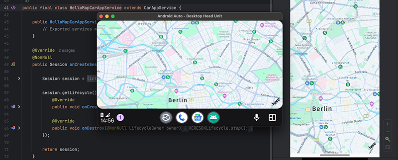 This tutorial shows how a MapView can be rendered in your car's infotainment display with Android Auto. Android Auto is an app on its own that is installed on the actual hardware of a car. It can be simulated using a Desktop Head Unit (DHU) app running on your development machine.