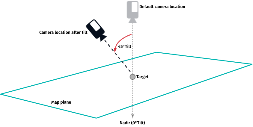 The camera can also be used to transform the flat 2D map surface to a 3D perspective to see, for example, roads at a greater distance that may appear towards the horizon. By default, the camera is not tilted (tilt = 0°).