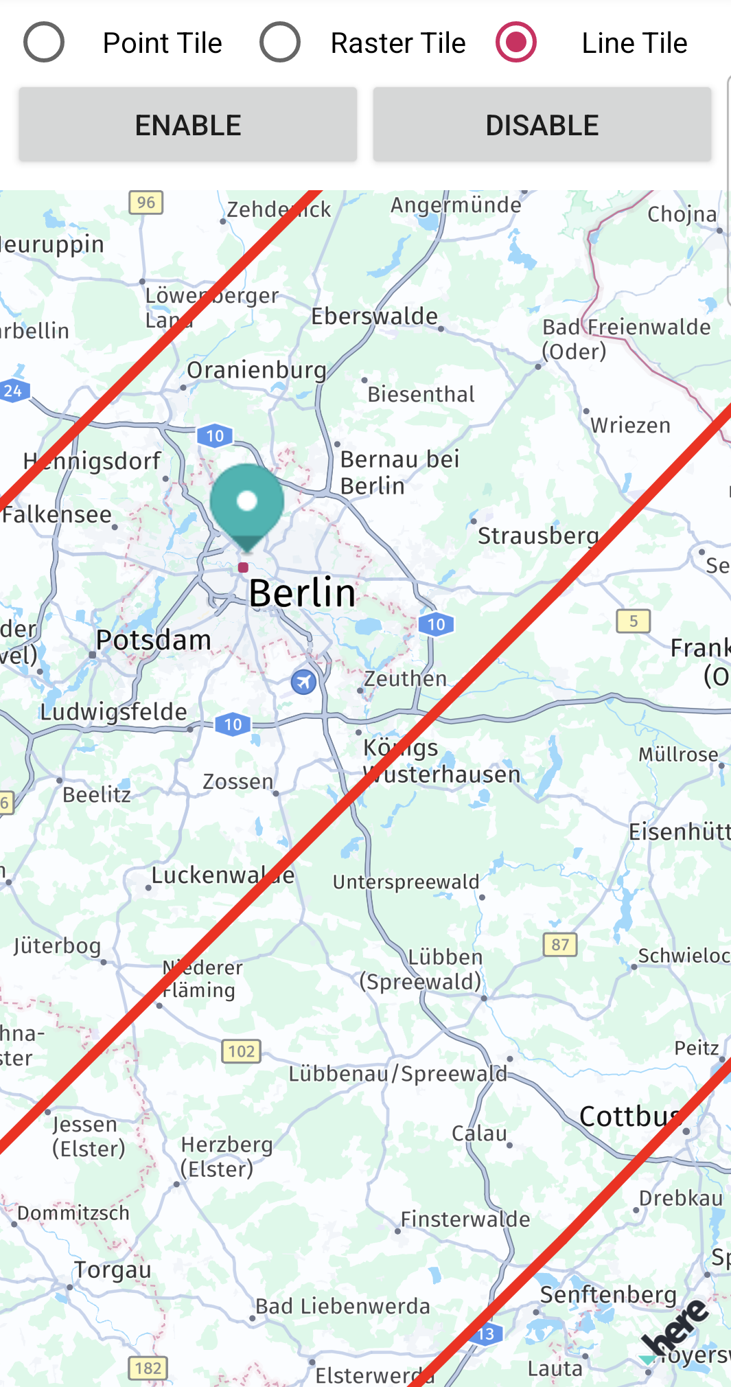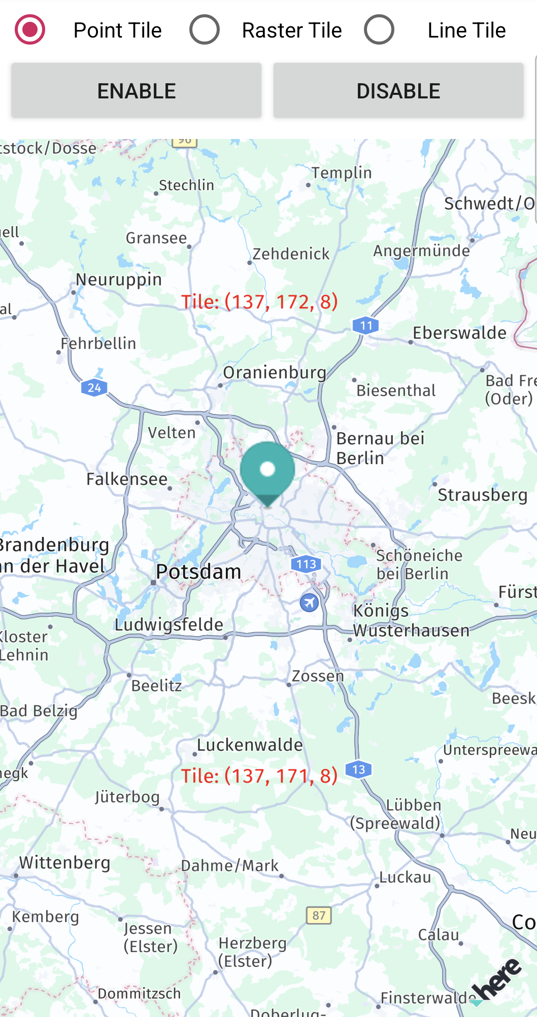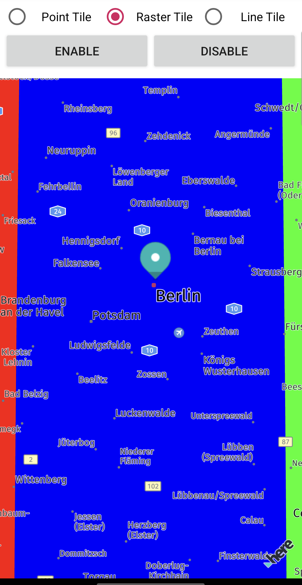 The above screenshot shows that you can easily combine custom raster tiles with other HERE SDK features. For example, you can render several MapMarker instances on top of the tile data from a tile server.
