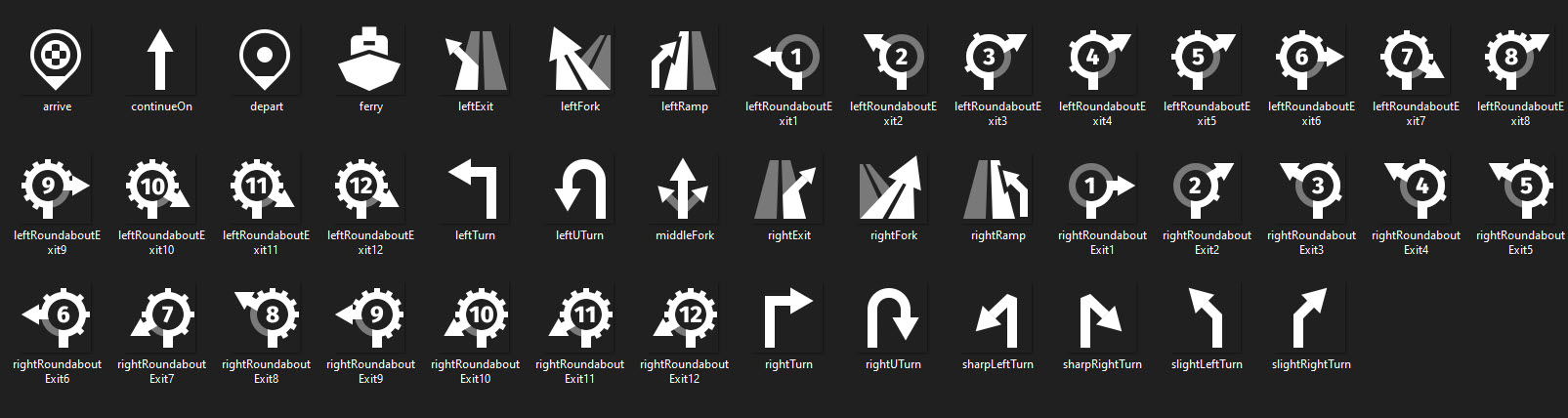 Below you can find the available selection of maneuver icons that can be shown to indicate a maneuver action - for example, during turn-by-turn guidance.