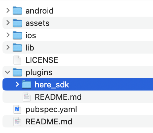 Now create a plugins folder inside your project and copy the renamed plugin folder to this new folder. With this, the content of the plugin folder is contained in hello_map/plugins/here_sdk.