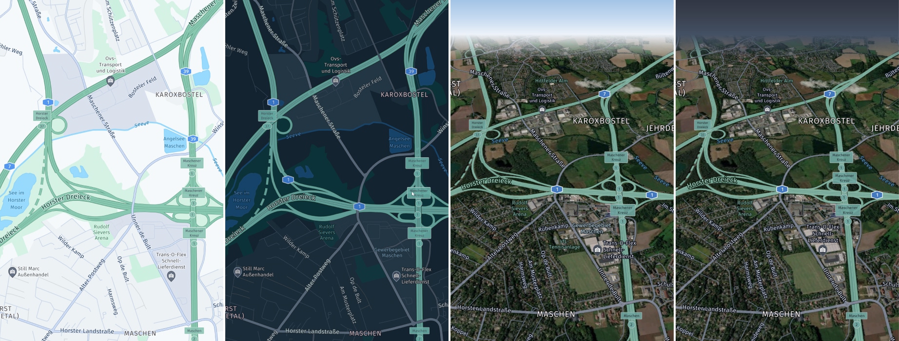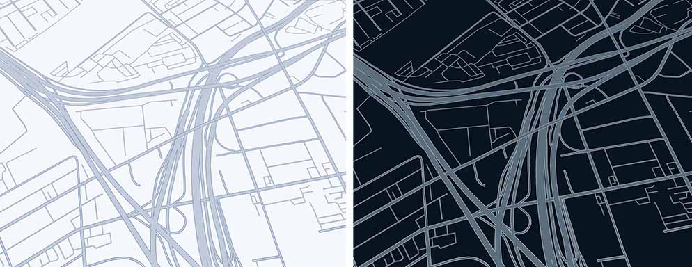 The available map styles are optimized to easily add additional content and overlays onto the base map without visual interference. The map schemes are less colorful and support a clean and neutral tone to maximize readability even in case of color blindness: