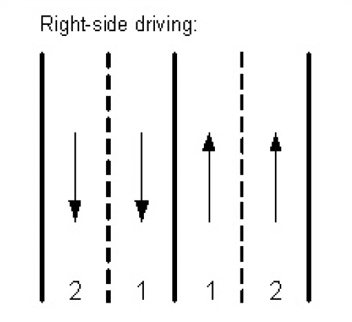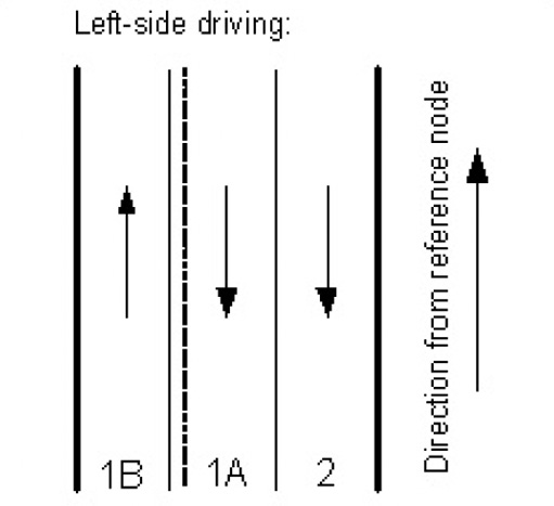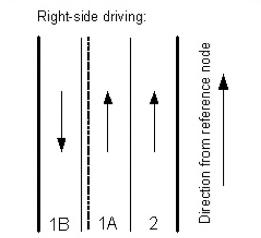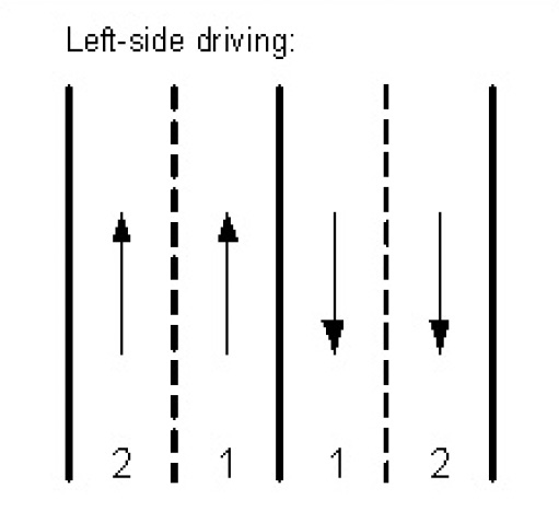 For left-side driving countries: Center divider marked (inner solid line, outer dashed line) specified for lane 1B. | For right-side driving countries: Center divider marker (inner solid line, outer dashed line) specified for lane 1A. |