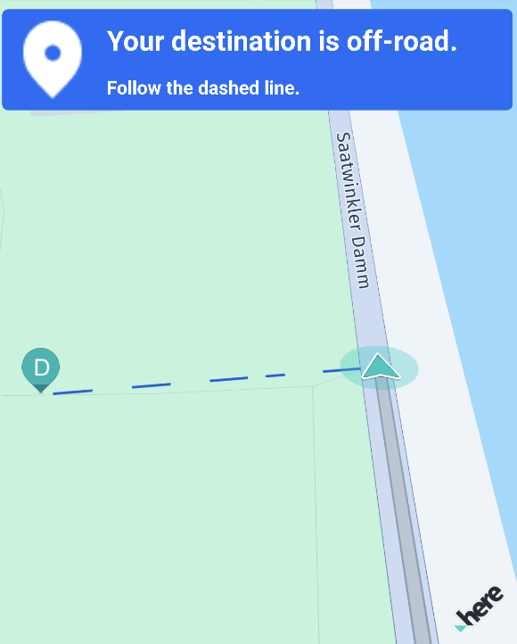 NoteThis feature does not guide a user along a path or provides any kind of maneuver information. Please make sure that the provided information is handled with care: only a straight line is drawn from the current location of the user to the off-road destination. In reality, the destination may be unreachable or may lie in dangerous territory that is impossible to be travelled by pedestrians. Make sure to notify your users accordingly.