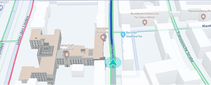 In addition, the VisualNavigator tilts the map, rotates the map towards the heading direction and shows a 3D location arrow and a LocationIndicator. All of this can be activated with one line of code: