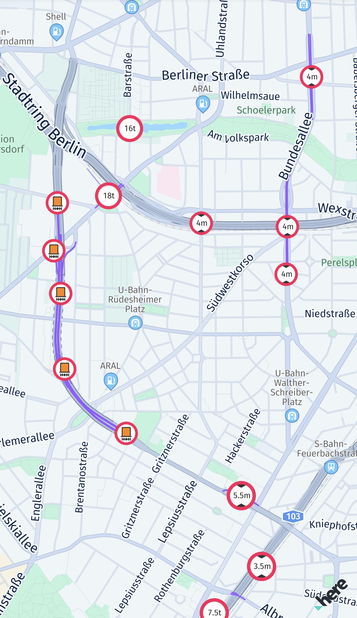 MapScene.Layers.vehicleRestrictions. It offers severalMapFeatureModes, for example, to highlight active and inactive restrictions as purple lines on an affected road - a gray line or a gray icon means that the restriction is inactive. If a road is crossing such a purple line - and the road itself is not indicated as purple - then this restriction does not apply on the current road. Note that an icon does not necessarily indicate an exact location: For example, in case of a restricted road an icon may be placed centered on the restricted road - or, if the restriction is longer, the icon may be repeated several times for the same restriction along one or several roads. The icon itself is localized per country and represents the type of restriction. For most restrictions, the location and the type of the restriction is also indicated through theTruckRestrictionWarningevent (as shown above). - Use