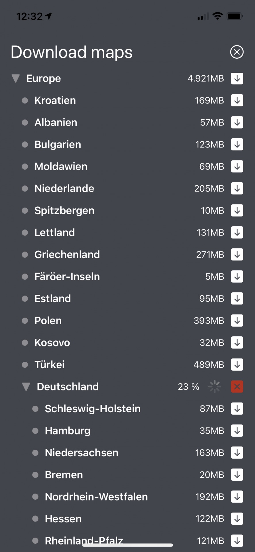 MapDownloaderto download a singleRegionor a list of regions. You can also download several regions in parallel. Show the download progress to the user by setting aDownloadRegionsStatusListener. Consider sequential downloads on such devices to lower the RAM pressure. - Use the