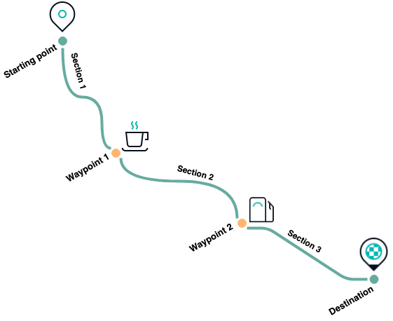 });By adding two additional stopover-waypoints to the route using the code snippet above, we now have three route sections between the starting point and the destination as seen in the illustration below.