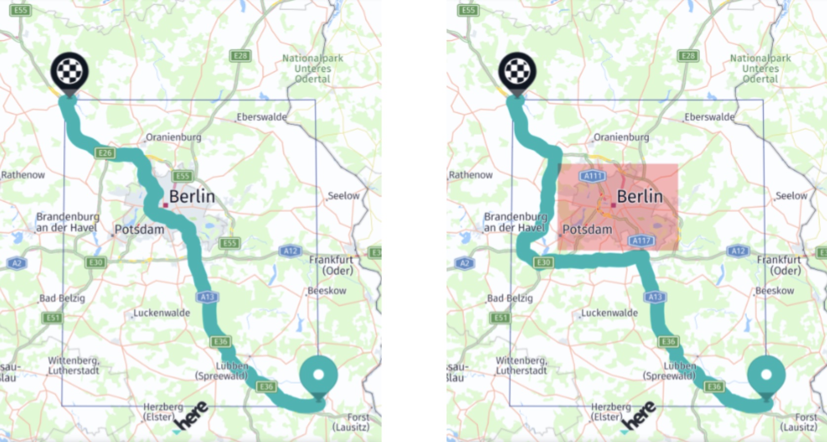 Screenshot: Two routes without and with an avoidance area.