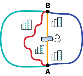 When you plan a trip from A to B, you may have the choice between four different roads. Let's assume that the green route represents a highway, then this road may be the fastest route, although it is longer than any of the other routes that would guide you through a city.
