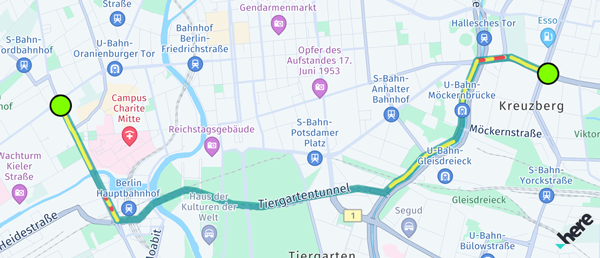 Note that this approach may be perceived as less accurate because the traffic information includes predictive data from the route instead of the real-time information provided by the traffic flow schemes. However, similar to the color encoding used for the traffic flow layer, you can indicate the traffic along a route using dynamicSpeedInfo.calculateJamFactor() that ranges from 0 (no traffic) to 10 (road is blocked). Each Section of a Route can contain various DynamicSpeedInfo instances. These are valid along the Span until the next Span. Each Span geometry is represented by a polyline that is part of the full route's polyline shape.