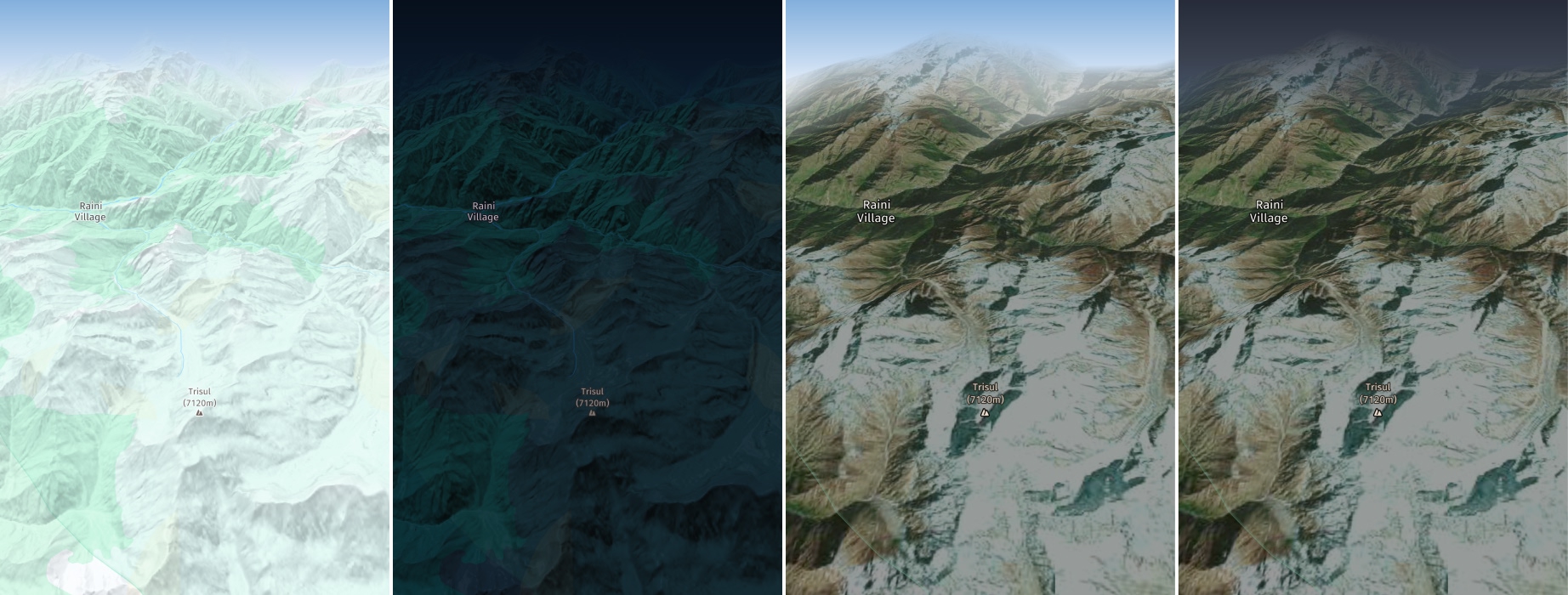 Each map feature supports one or more alternative rendering options. For example, instead of using terrainHillshade, which is the default mode for terrain, you can use terrain3d to show advanced topographical shading for hills on a true 3D terrain map view.