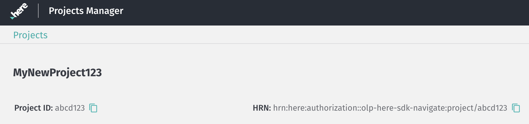 - Open the Launcher menu and select Manage and then the Projects Manager. Then create a project and copy the project HRN string for later use. In the Projects Manager, you can define several projects / apps. Each project / app is identified through a unique HRN, for example: "hrn:here:authorization::olp-here-sdk-navigate:project/abcd123". The actual value is unique for your project / app.