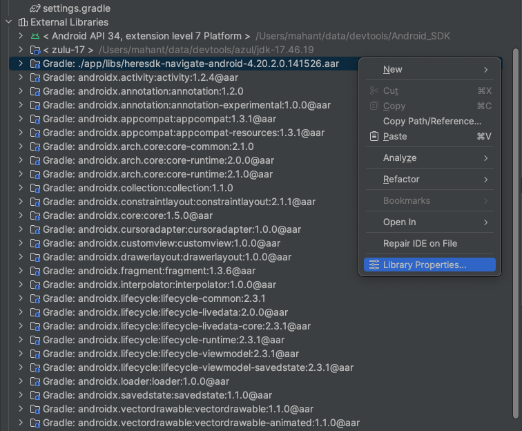 - Right-click on the HERE SDK AAR file and choose Library Properties.
