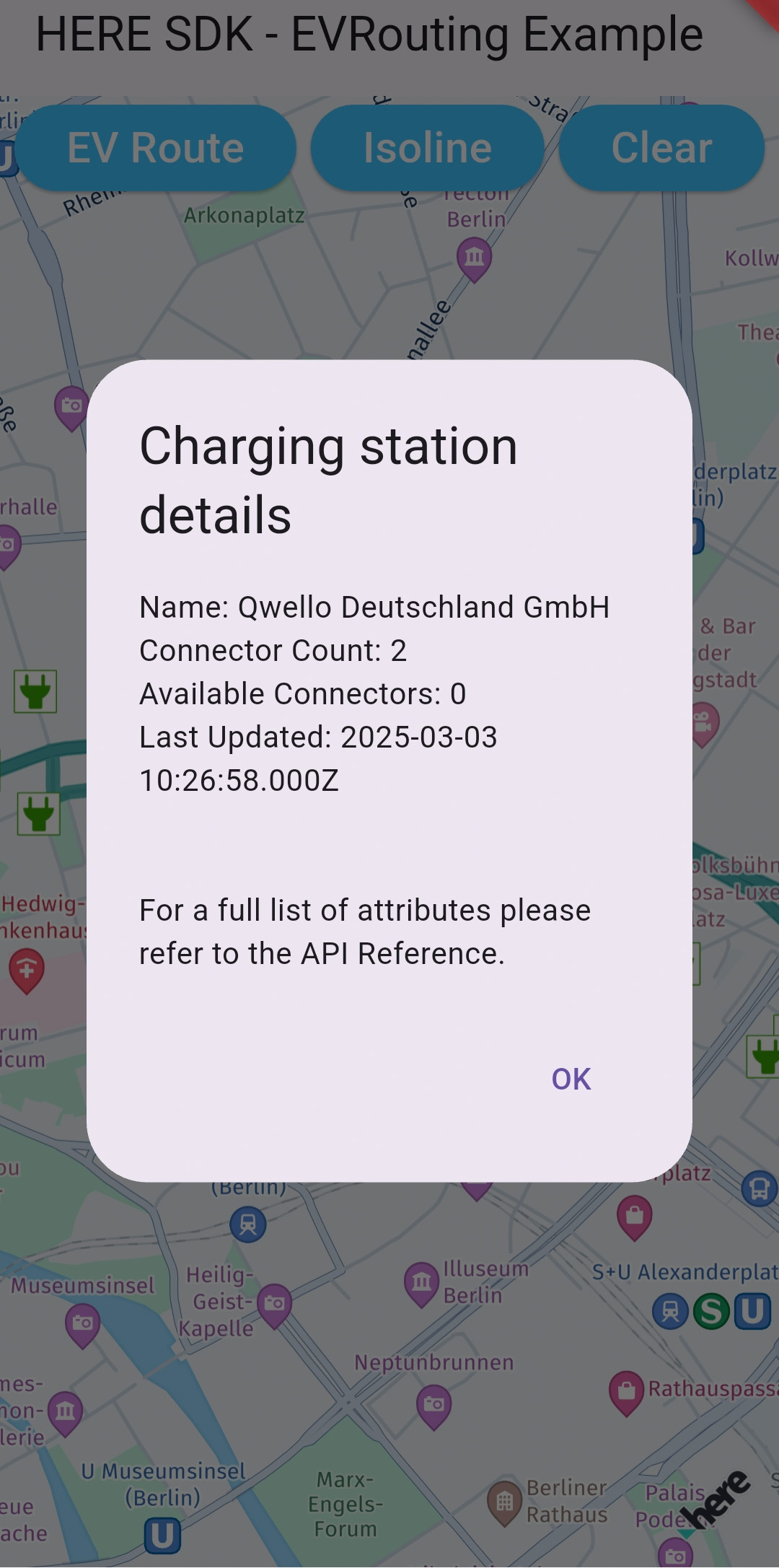 }See the screenshot below for an example of how this appears when you click on a charging station. A pop-up will display the charging station name, connector count, available connectors, last updated time, and more.