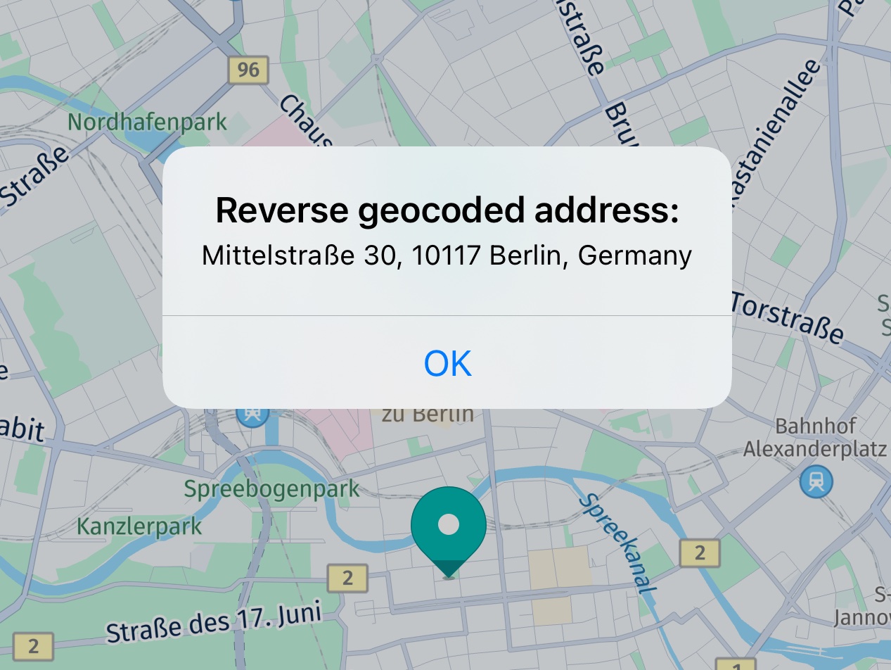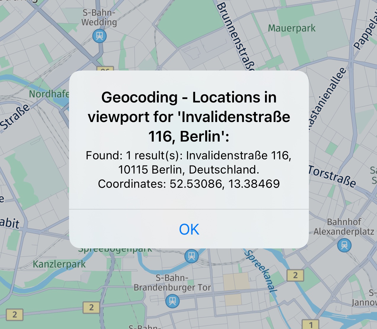 }See the screenshot below for an example of how this might look if the user picks such a result from the map. If you are interested, have a look at the accompanying "Search" example app, that shows how to search for an address text and to place map marker(s) at the found location(s) on the map.