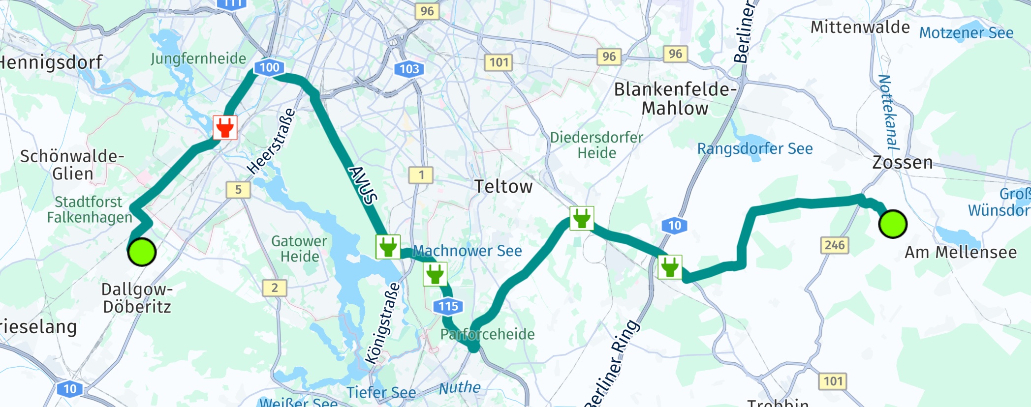 At the start and destination coordinates of the route, the corridor will have a round shape - imagine a snake with a certain thickness, but just with round edges at head and tail. Do not confuse this with the shown screenshot above, as we simply rendered green circles to better indicate start and destination of the route.