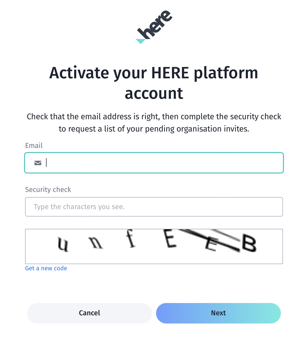 If your organization already has a HERE platform account, contact your account administrators to get invited to your organization.