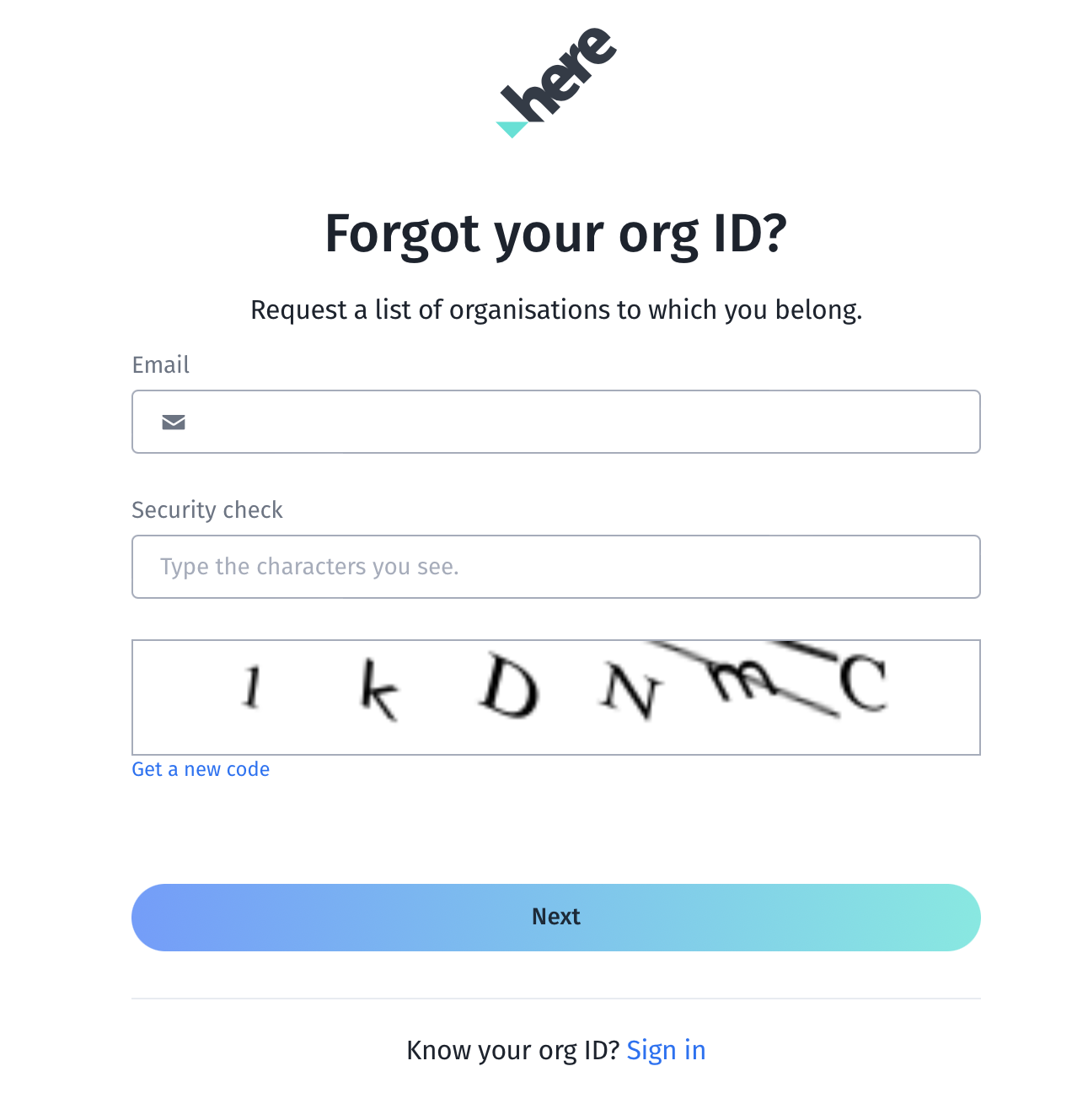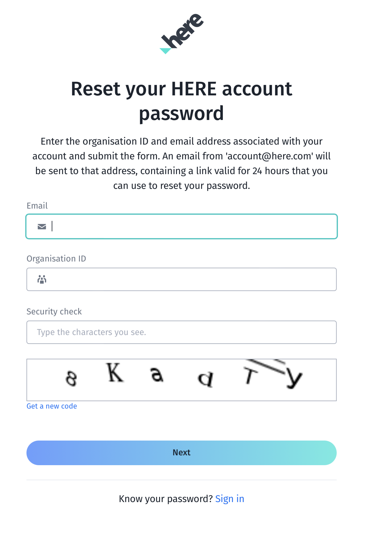 - Enter the organization ID and email address associated with your HERE account, and submit the form. You then receive a link which you can use to reset your password.