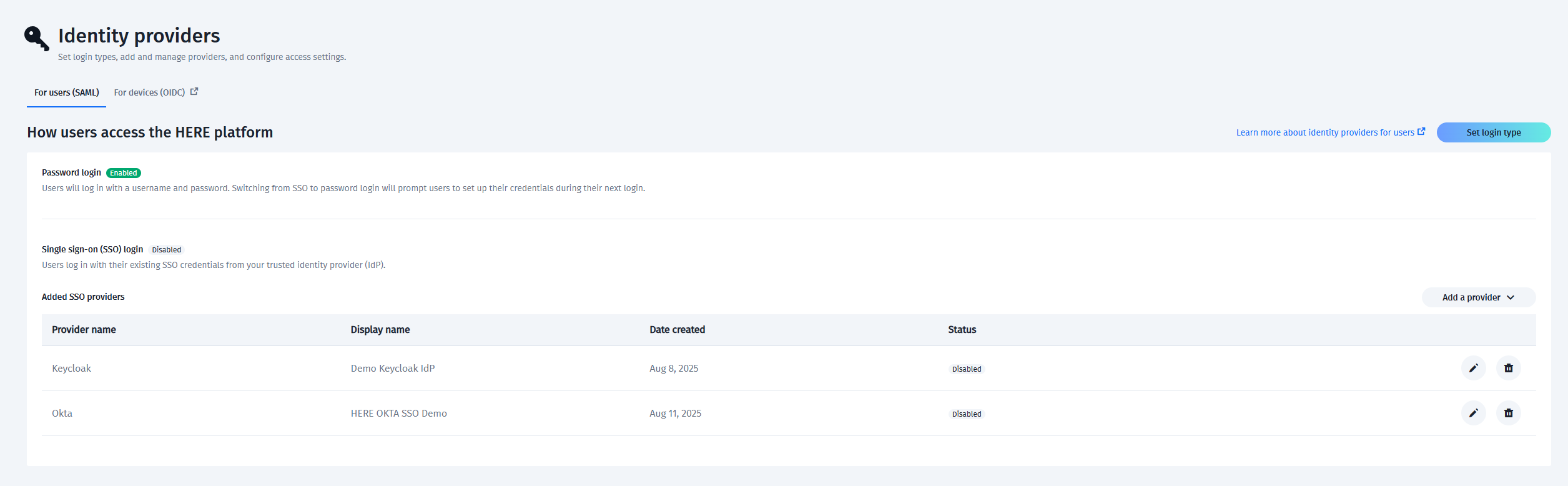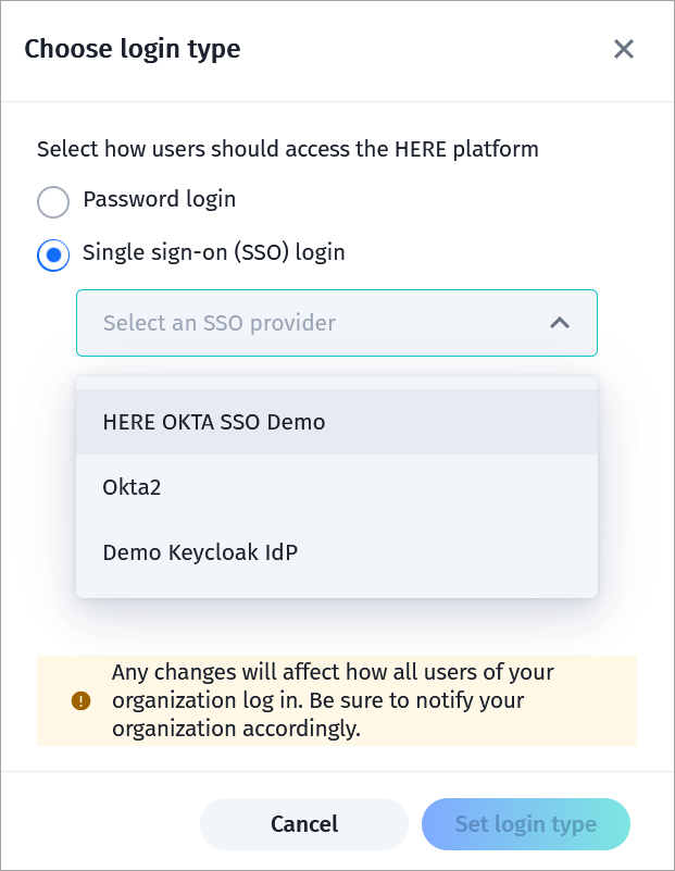 Select Set login type from the Identity Providers page, and choose Single Sign-On (SSO) login.