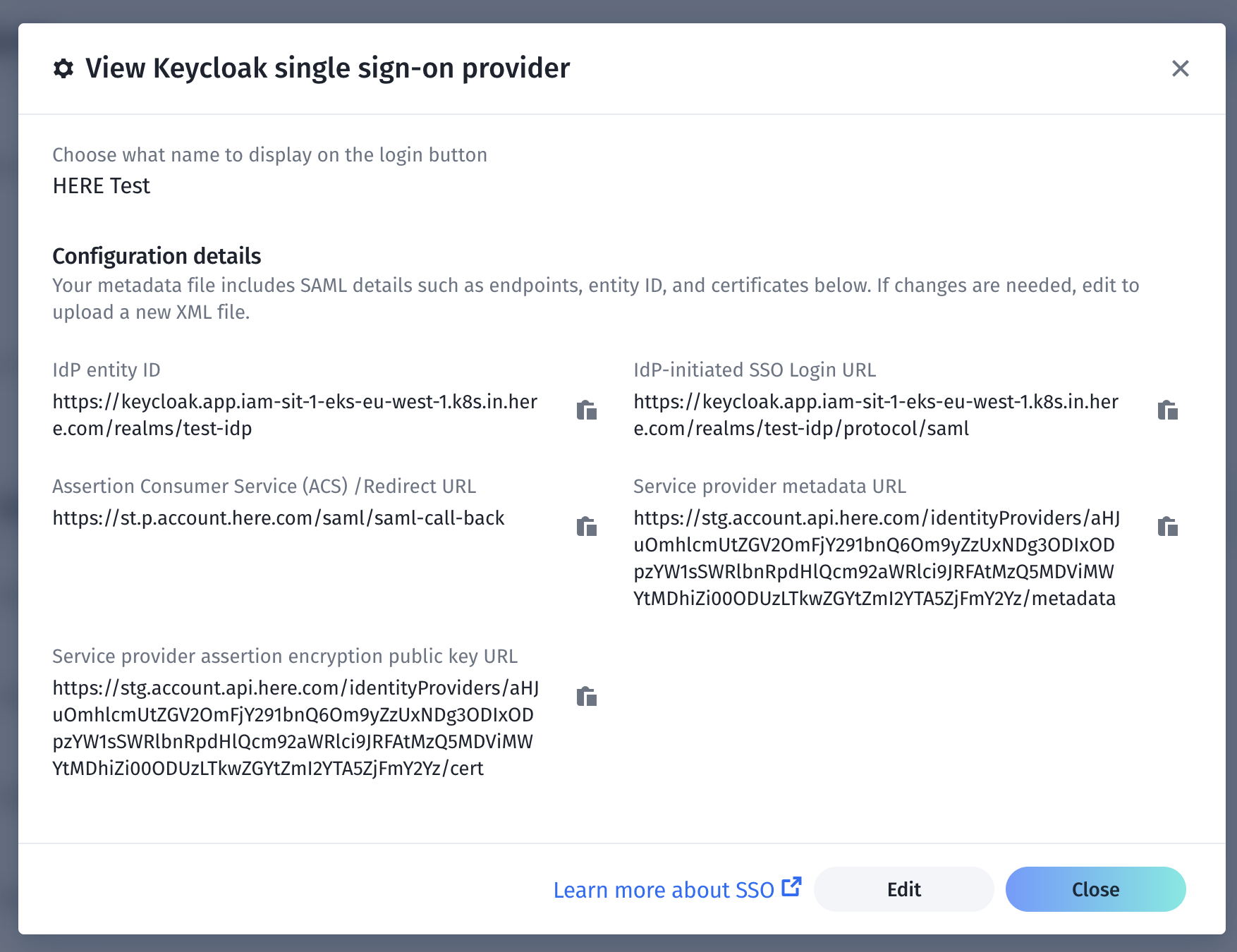 SP certificate URL https://account.api.here.com/identityProviders/aHJuOmhlcmUtZGRlbnRpdHlQcm92aWRlci9TQtZ0NTA4LTk0YmYtMjNlOTdkNTE3ZjYx/cert- Verify the entity ID and SSO login URL.