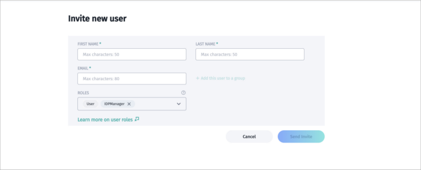 - Invite a new user, and assign them the IdP Manager role.