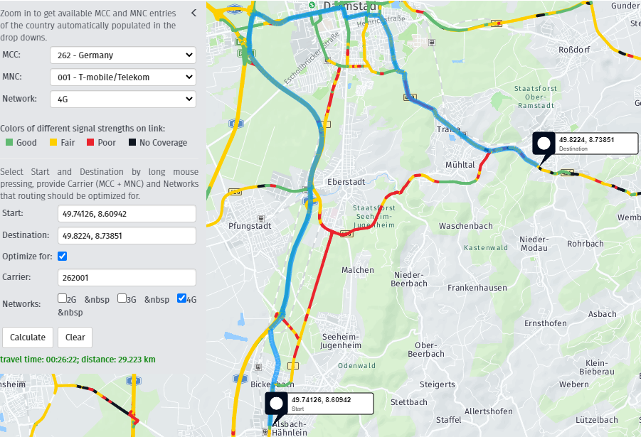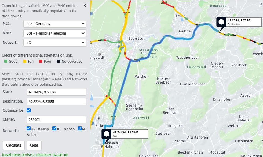 - If 2G/3G signal is enough, the plotted route goes through a forest. It's faster, but it doesn't have 4G coverage.