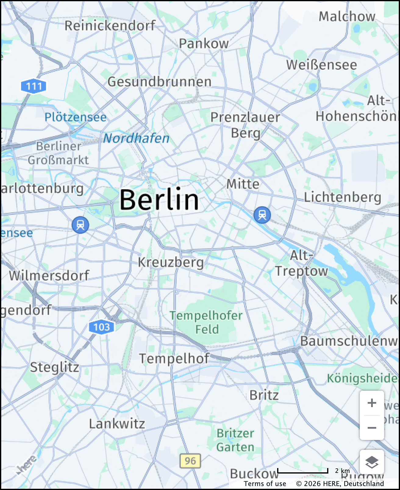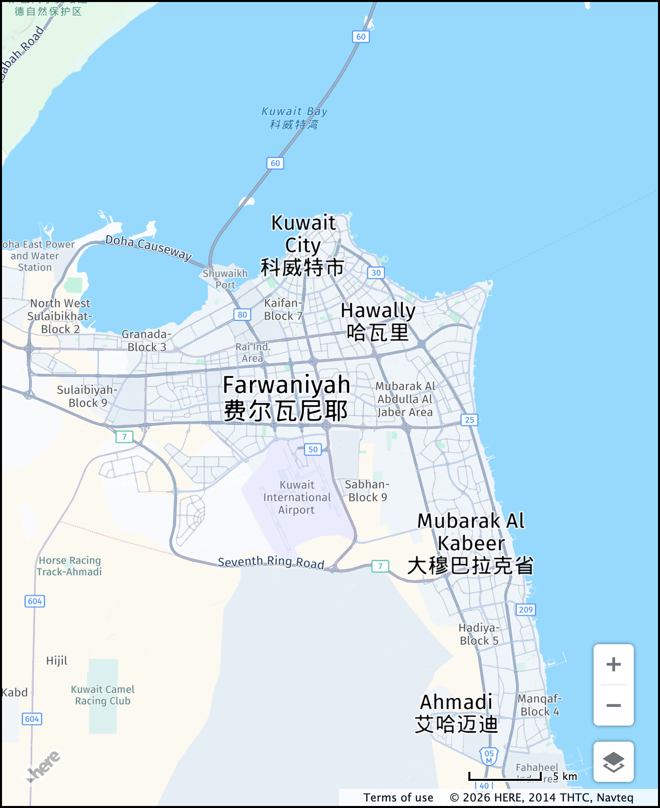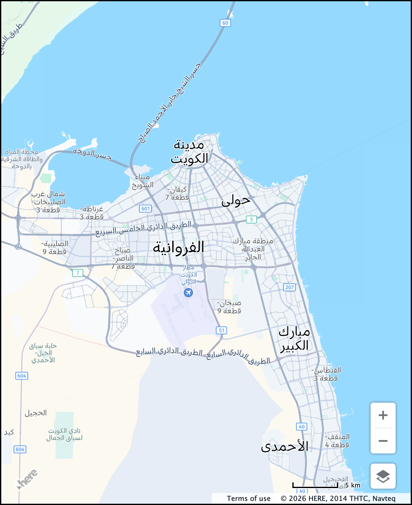 By default, the HERE Maps API for JavaScript displays map labels in each country's local language, depending on the data availability. The labels for ocean, sea, and bay features are shown in the language of the country a specific water body is adjacent to. However, you can localize labels and place names with the following options: