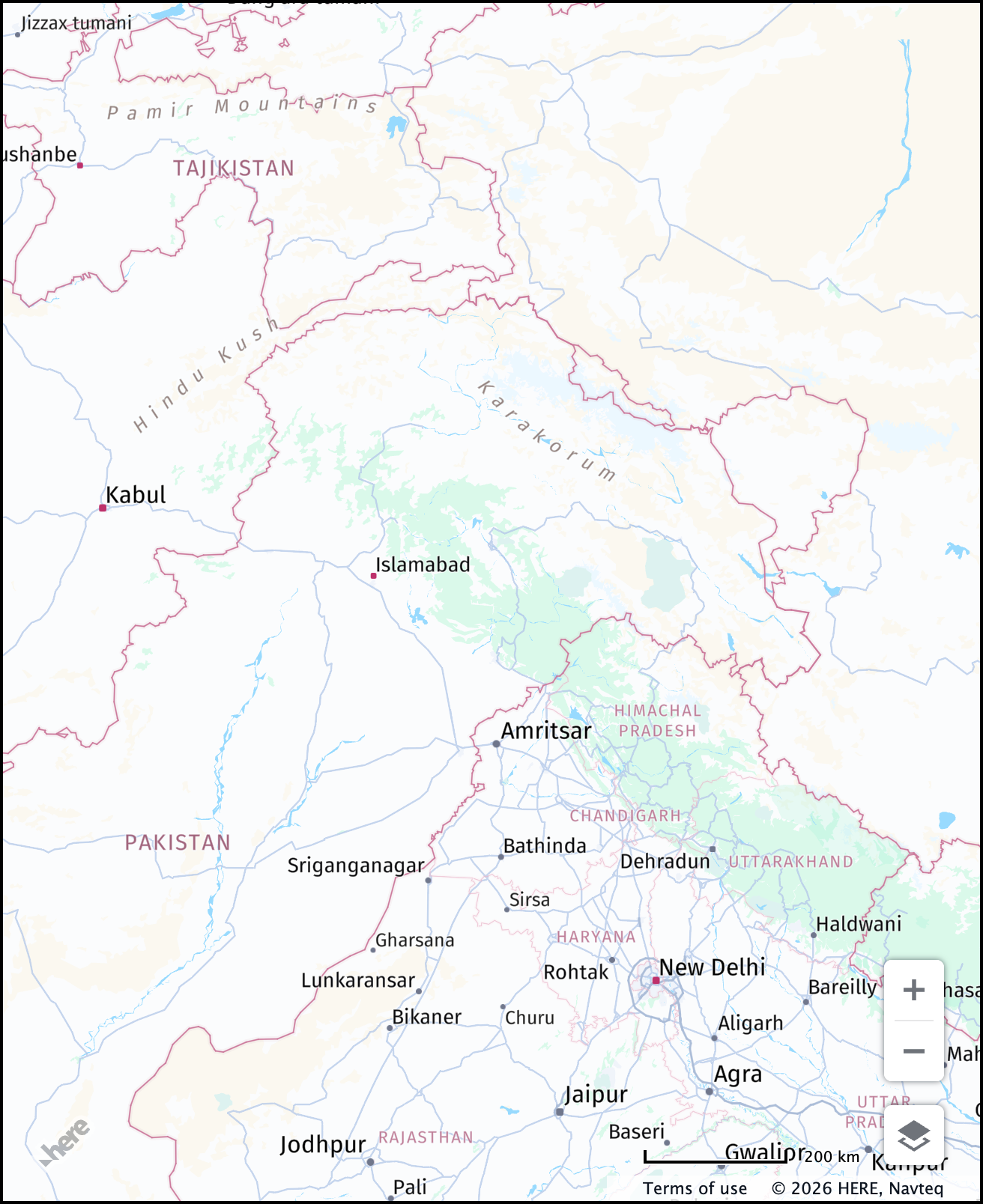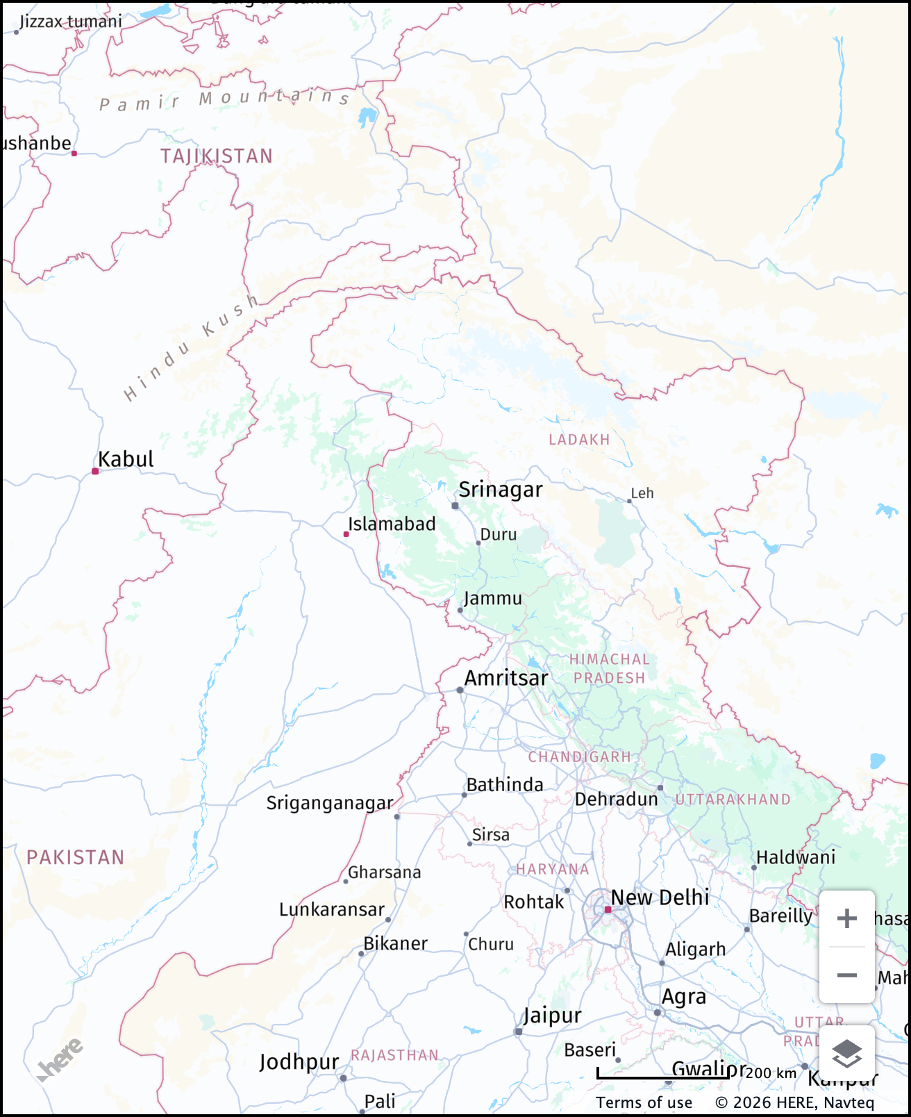 The default view configuration in the HERE Maps API for JavaScript presents the international perspective, visually representing disputed territories with dashed borders. For example, Jammu and Kashmir, along with Ladakh, are shown as disputed areas between India and Pakistan: