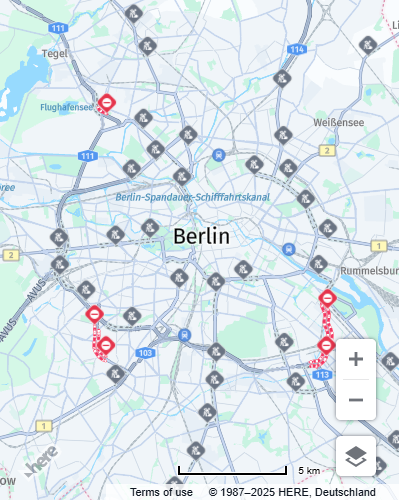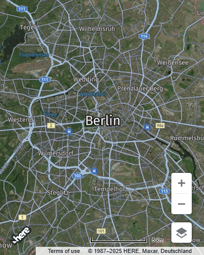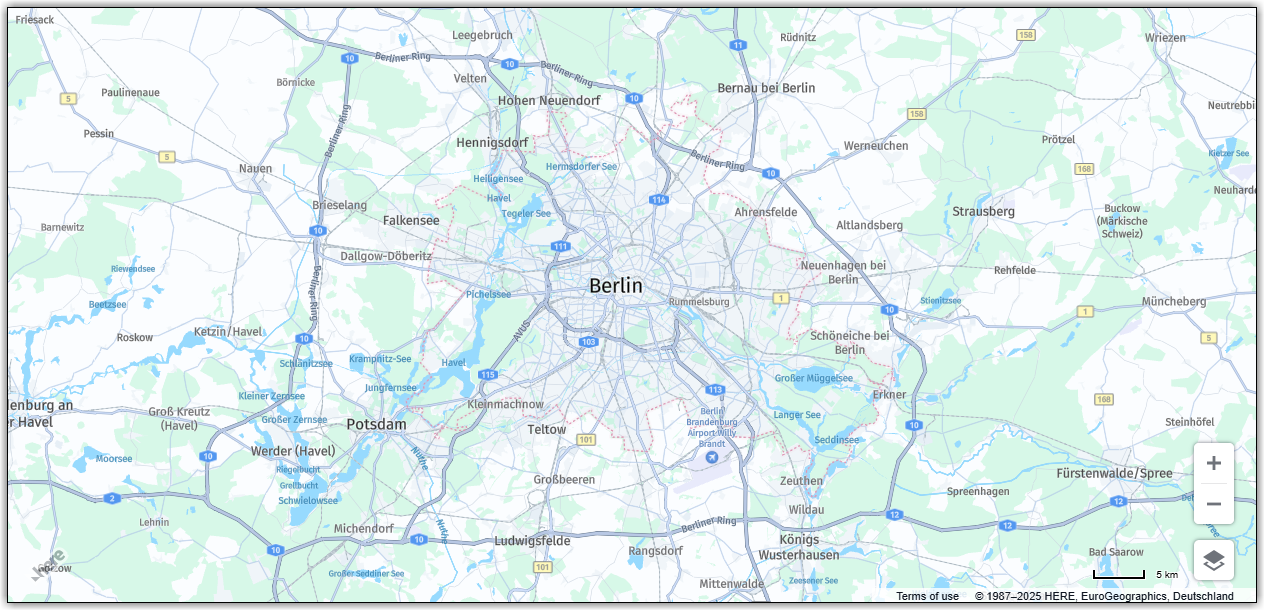 Mapobject with the following specifications: map type set tonormal, zoom level set to10, and the map center located at latitude52.5and longitude13.4, which corresponds to Berlin, Germany.// Obtain the default map types from the platform object: const defaultLayers = platform.createDefaultLayers(); // Instantiate (and display) a map object: const map = new H.Map( document.getElementById('mapContainer'), defaultLayers.vector.normal.map, { zoom: 10, center: { lat: 52.5, lng: 13.4 } });