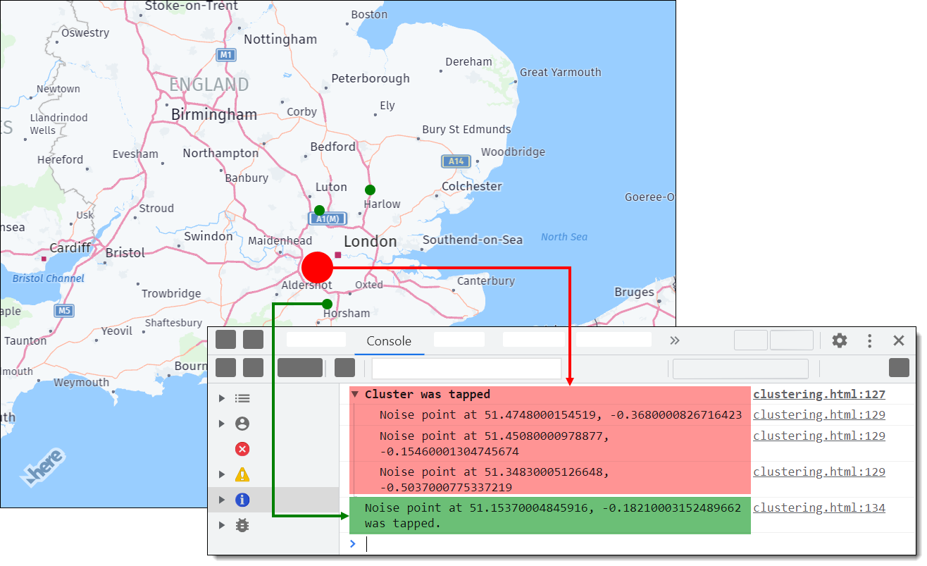 You can interact with markers representing clusters and noise points and access cluster (H.clustering.ICluster) or noise point (H.clustering.INoisePoint) data on demand by using map events.