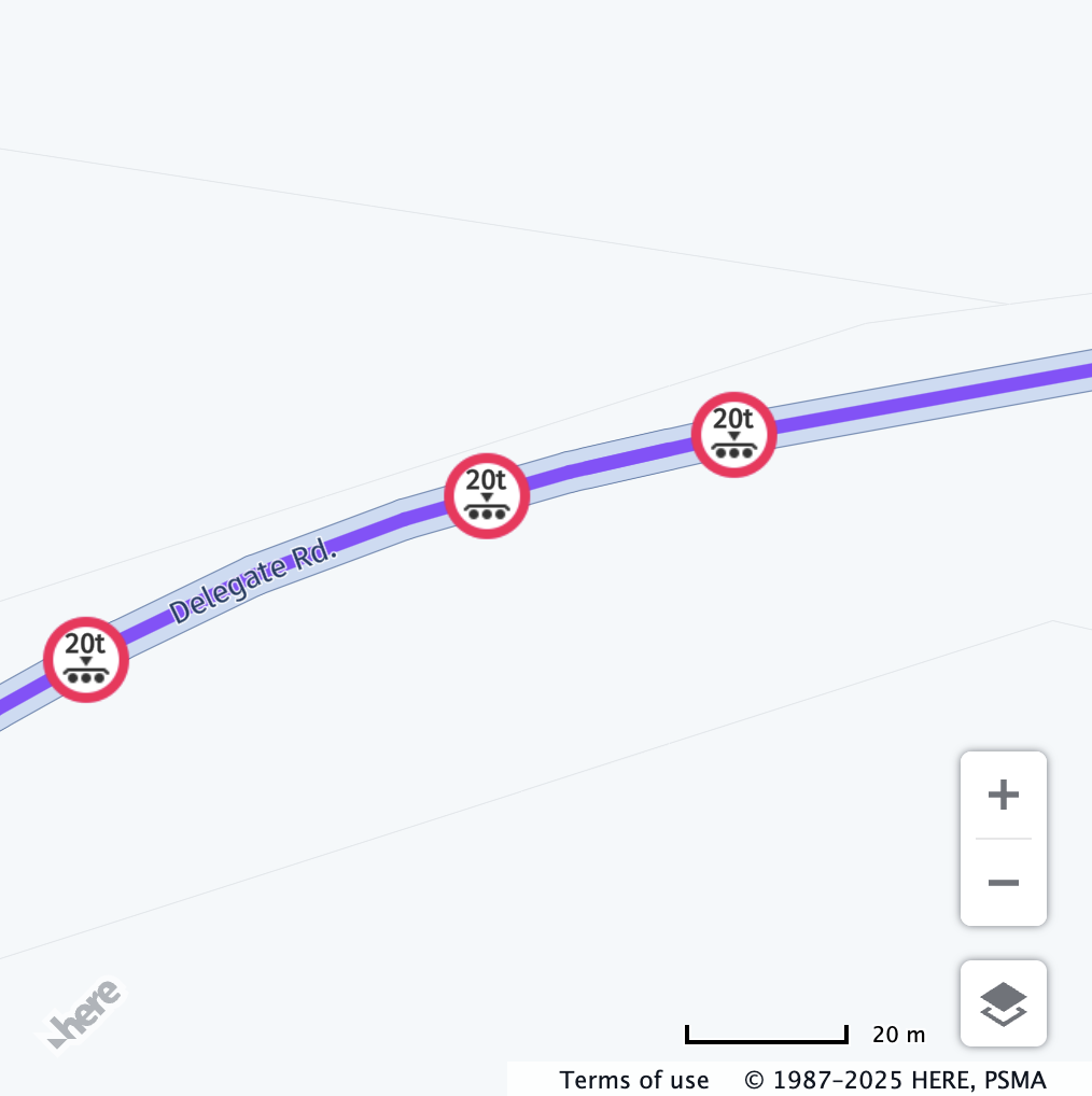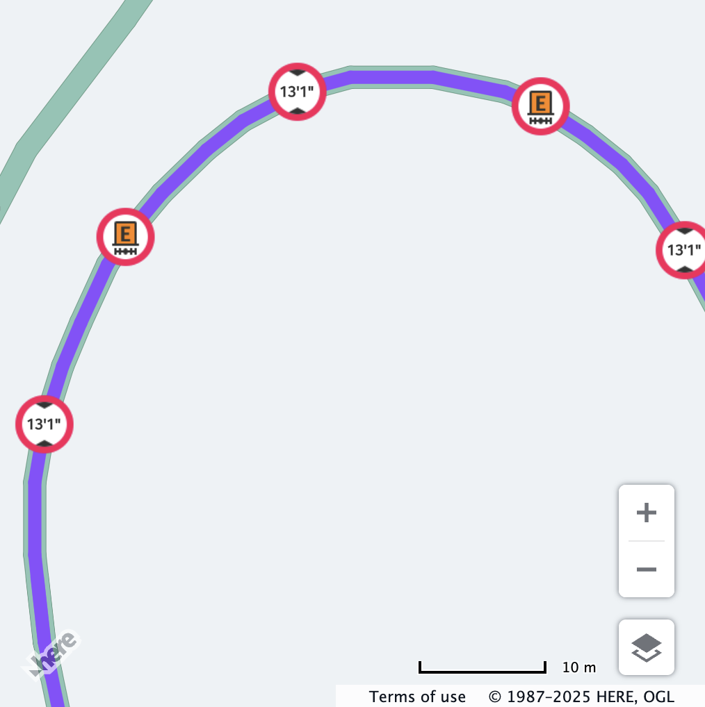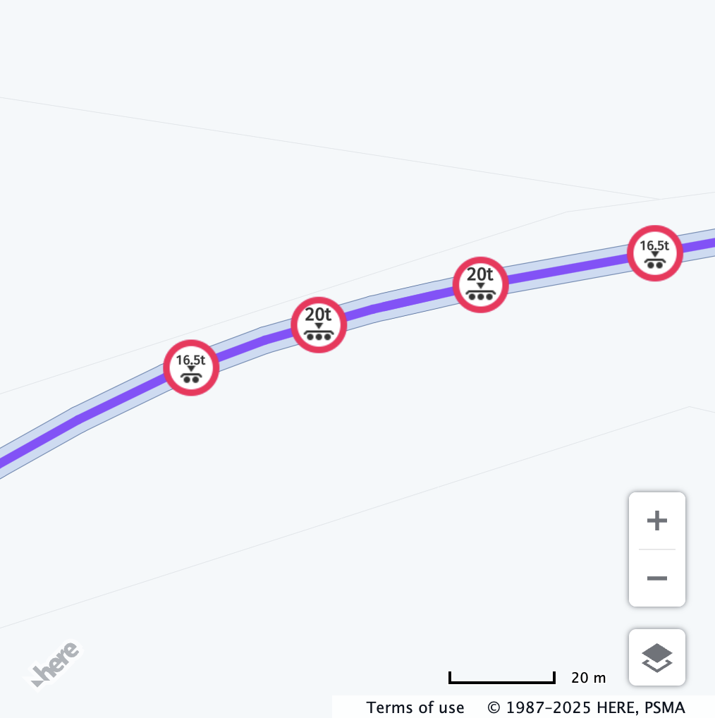 HERE Maps API for JavaScript provides a way to visualize all vehicle restrictions on the map by means of the "vehicle restrictions" feature in the appropriate mode. Features and modes allow you to control which types of map data are rendered. For example, activating the "vehicle restrictions" feature in the "active & inactive" mode will display all available restriction icons and signs. For more details on how to use features and modes, see Customize map display through features and modes.