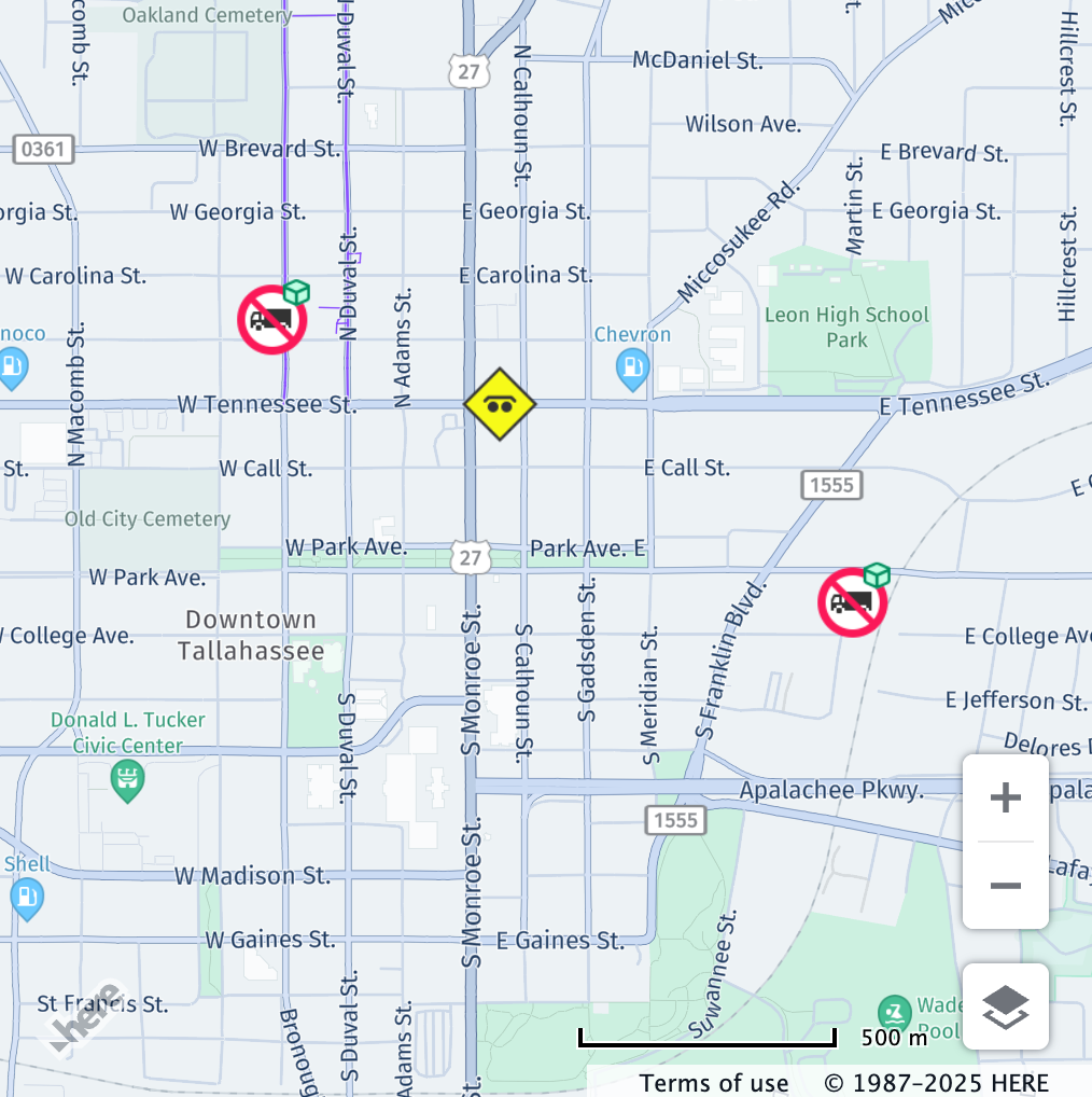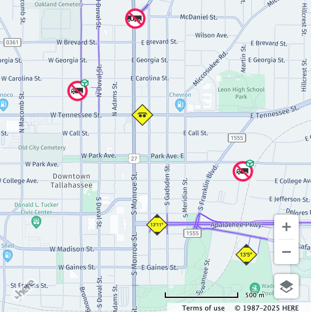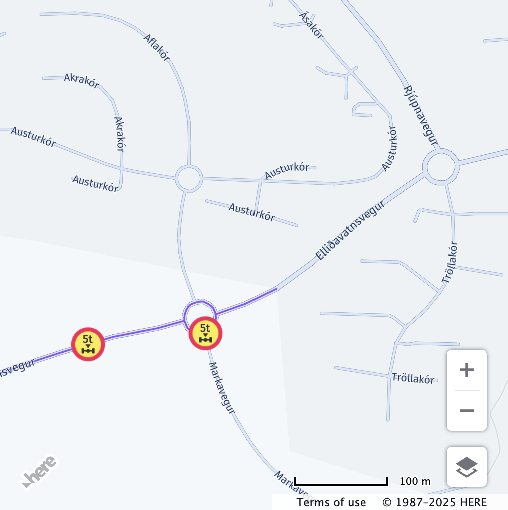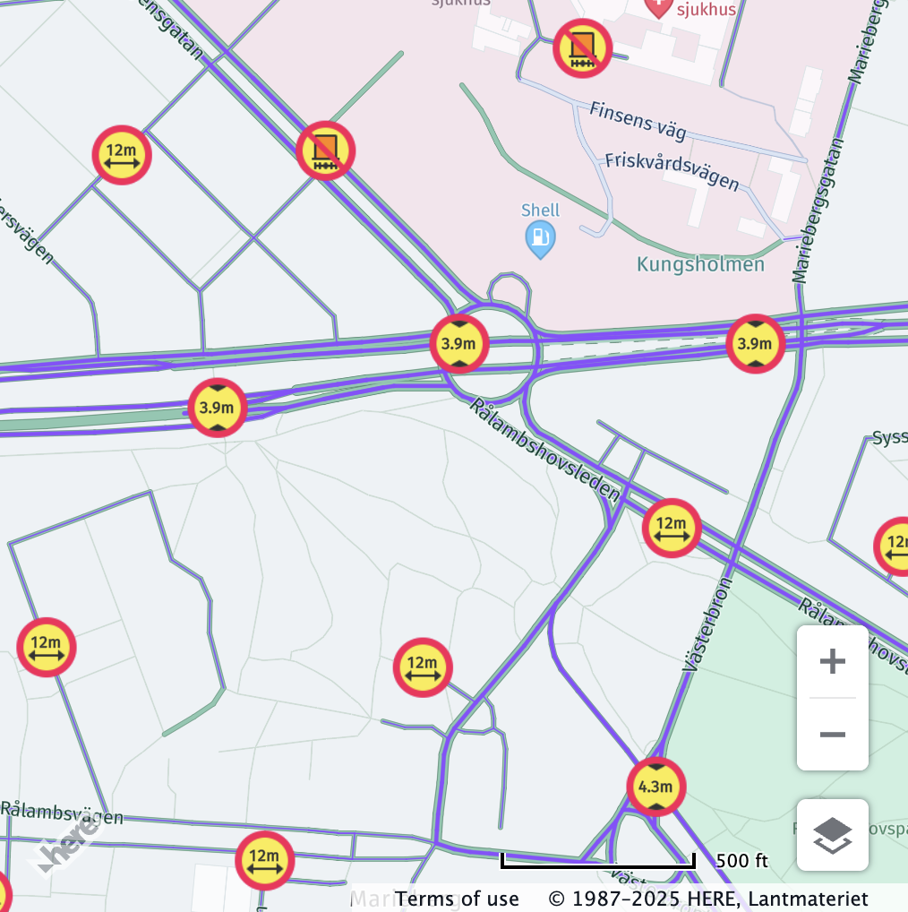 HERE Maps API for JavaScript provides a way to visualize all vehicle restrictions on the map by means of the "vehicle restrictions" feature in the appropriate mode. Features and modes allow you to control which types of map data are rendered. For example, activating the "vehicle restrictions" feature in the "active & inactive" mode will display all available restriction icons and signs. For more details on how to use features and modes, see Customize map display through features and modes.