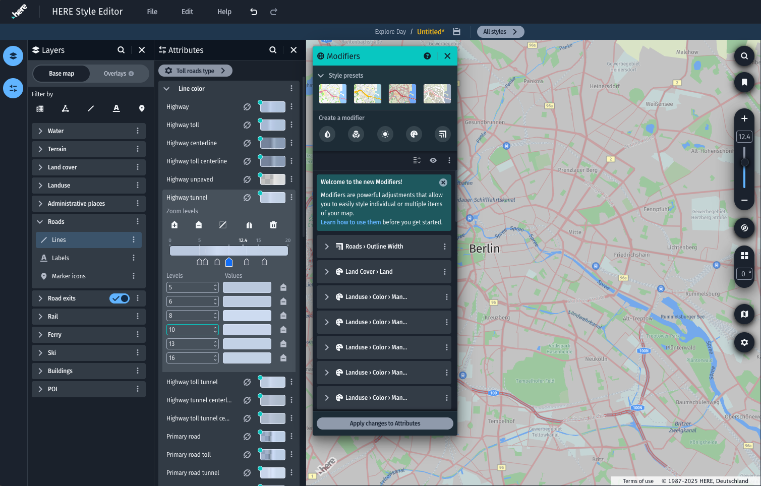 The Attributes panel displays the individual styling properties and associated data conditions of your selected layer. Attributes define how a layer's data is displayed (styled) in the map. Attributes can have static values, such as a single color for water polygons, or a gradual change of values across zoom levels, such as for POI label sizes. Attributes represent your base style values. These values can be overwritten when you apply changes to Modifiers.