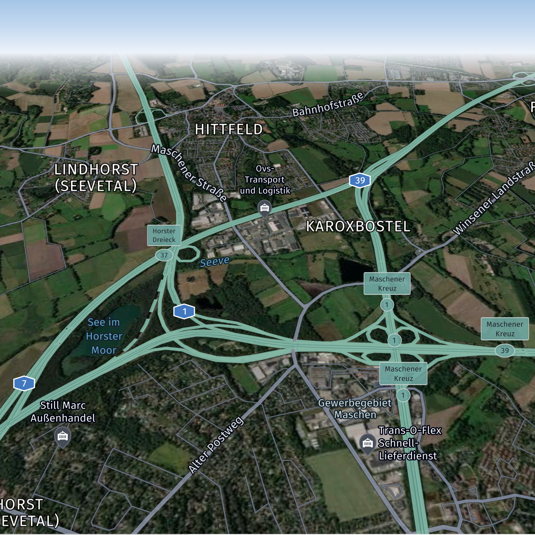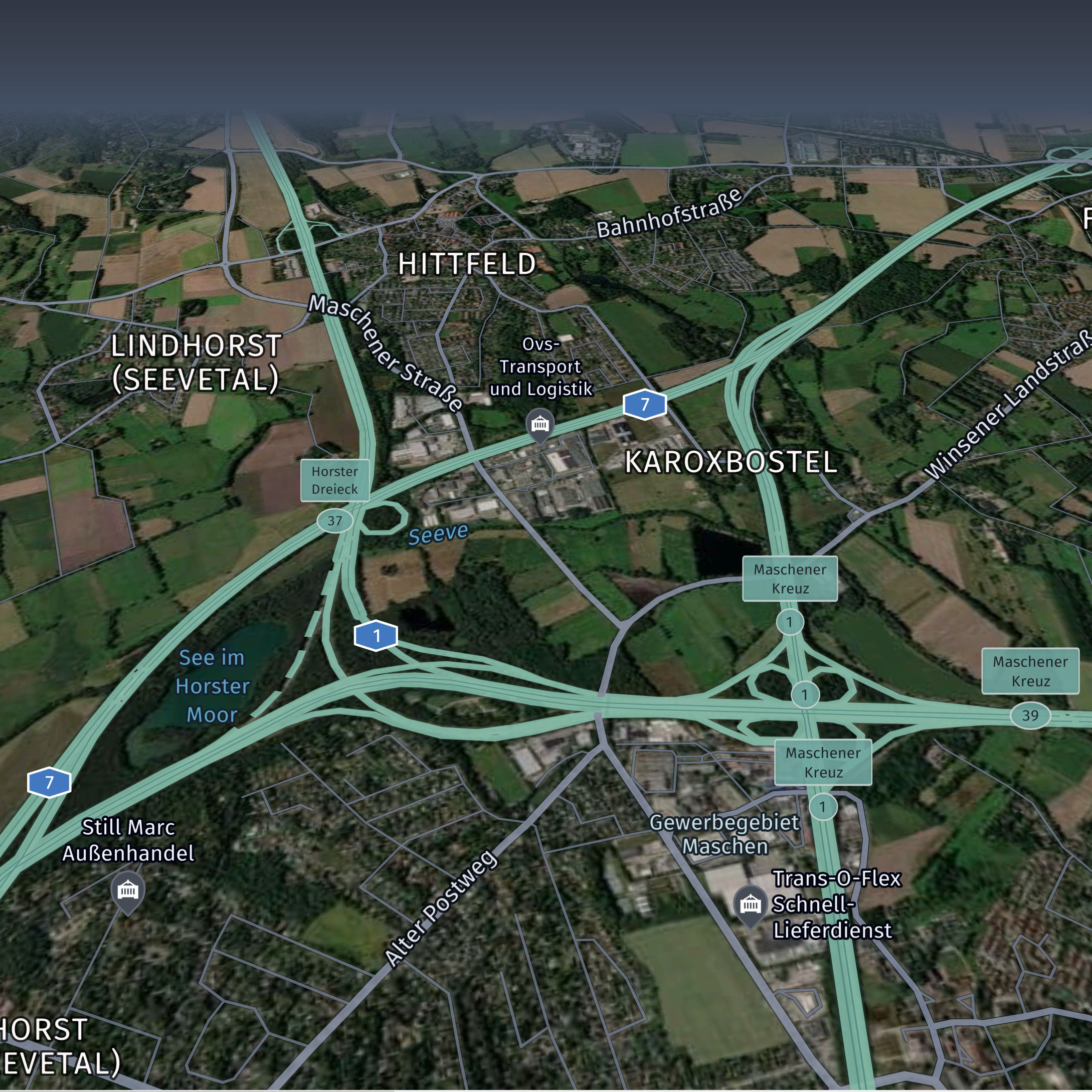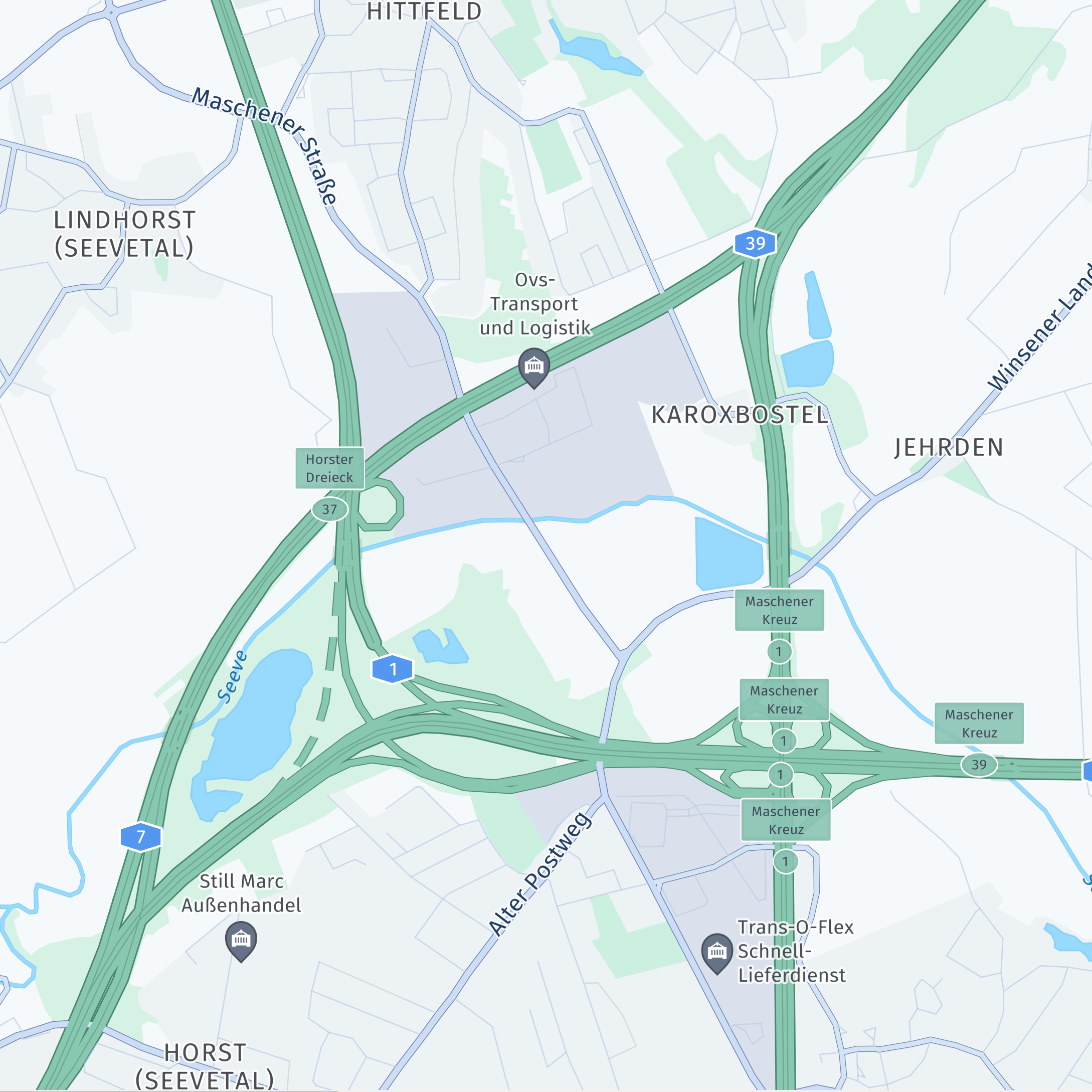 The logistics scheme highlights fleet and truck-related map elements, such as truck toll roads, highway exit names and numbers, and truck-specific POIs. It is designed for truck and logistics use cases, including dispatching, fleet management, and delivery.