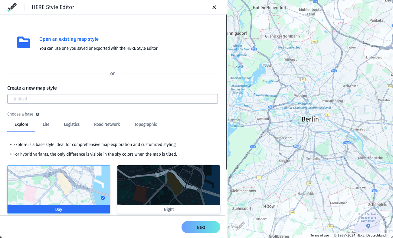 - When you first login, select a base map style family and a specific flavor, such as the Day or Night base style. For more information about base map style options, see the map styles documentation.