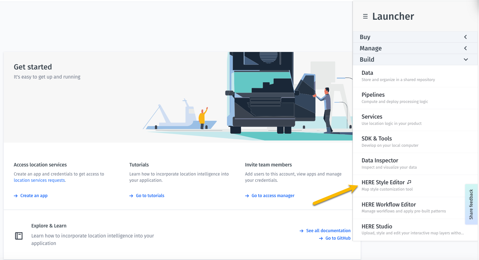 - On the right-hand side, you'll find the launcher panel. Click on the HERE Style Editor link.
