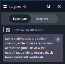 The base map styles offer optional support for styling the Japan map region with region-specific details.