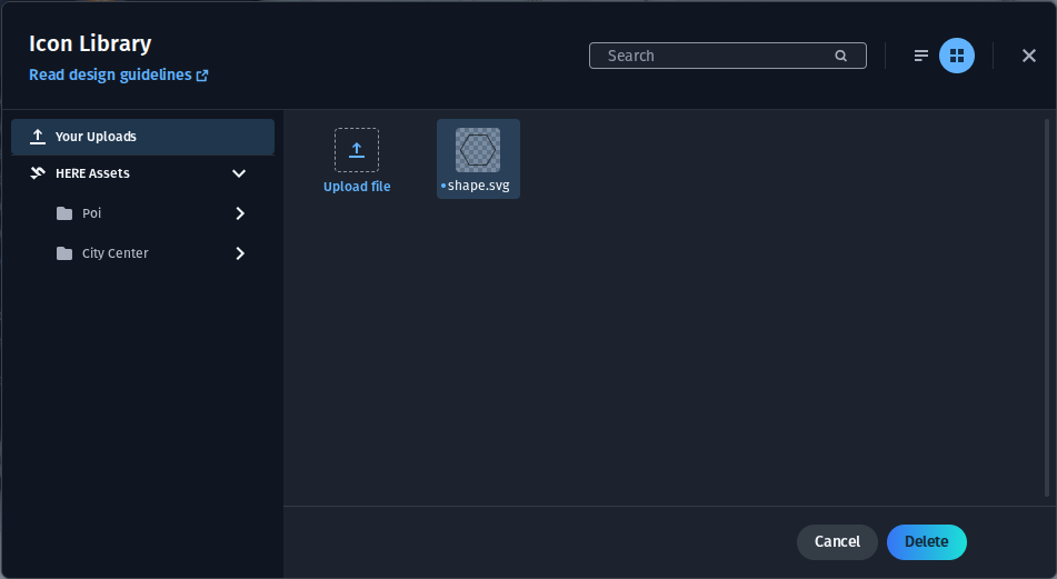 The left side of the Icon Library window allows navigation between the user uploads and the default HERE icon sets. Only icons from the Your Uploads section can be deleted.