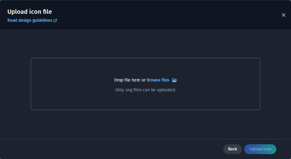 Clicking the Upload file action button within the Your Uploads icon category opens up the upload screen for selecting a local icon to upload. You can either use the Browse files action to select a file using a file dialog, or drag in an icon to the upload screen.