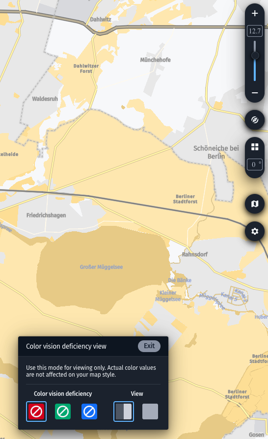 You may enable the color vision deficiency view to try out how your custom map style would look like for people with color vision issues. This switch opens up a separate control panel where you can toggle between a split screen and a full screen color vision simulation, as well as switch between simulations of some of the common color vision deficiency types.