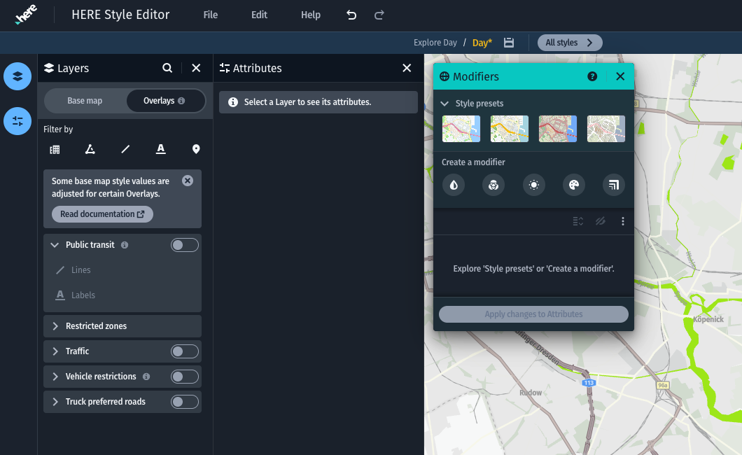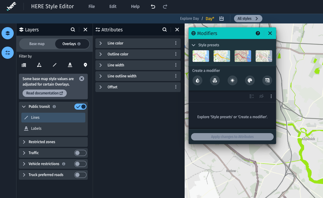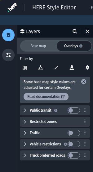 Public transit- Lines and labels for public transit stations and routesRestricted zones- Polygons and labels for special areas with certain entrance restrictionsTraffic- Lines and icons for traffic severity and known incidents on roadsVehicle restrictions- Lines and icons for certain road usage restrictionsTruck preferred roads- Line decorations for roads that should be preferred for heavier vehicles (only available for the Logistics base map styles)