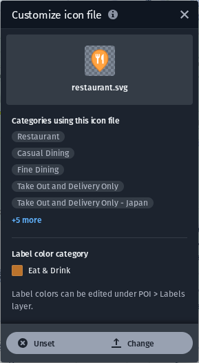 Clicking an icon entry opens up the Customize icon file popup window. The popup window displays more information about the icon usage and the currently used label color if the icons have an attached text label.