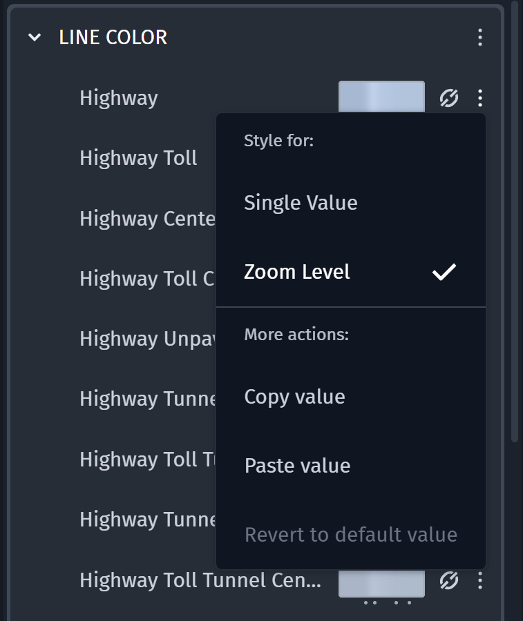 Click the color swatch itself to open either the color picker or the zoom editor, depending on which input was last used. By default, the HERE styles have a mix of both static values and zoom level based changes.