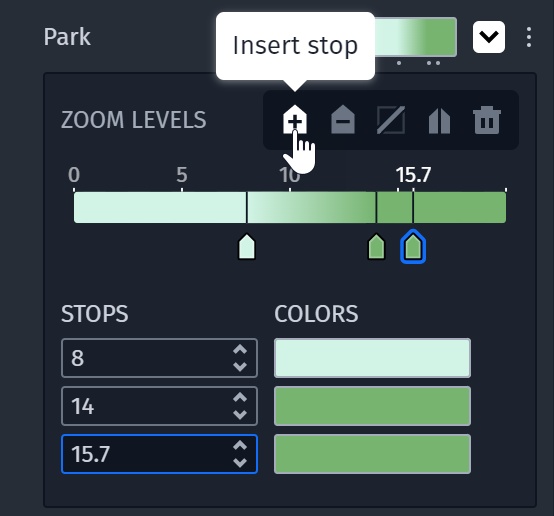 - Click the add button to add a stop at your current zoom level, then zoom in or out on the map and add another stop. The white number above the range bar represents your active zoom level in the MapView. Use the color swatch beneath the range bar to set your desired color for each stop.