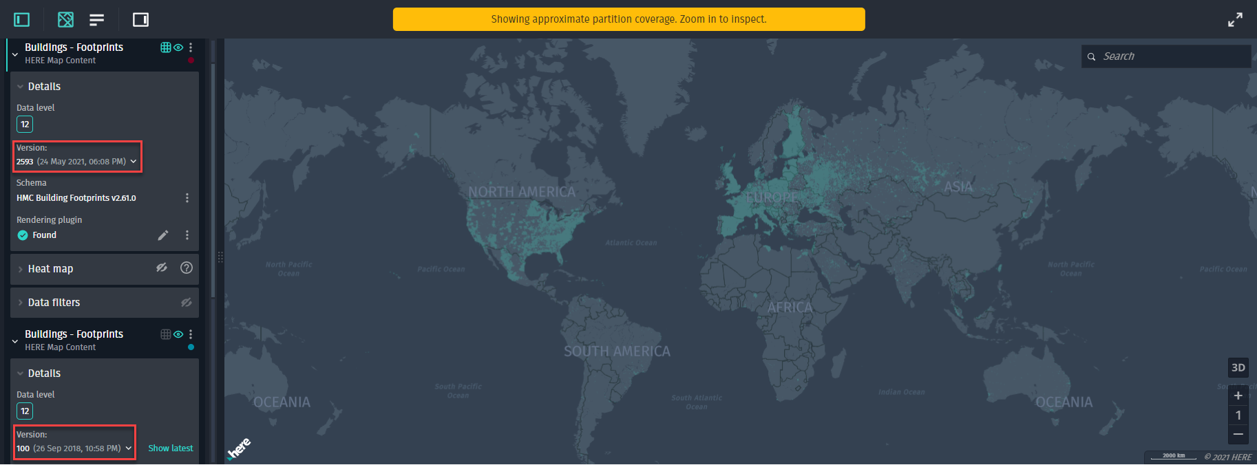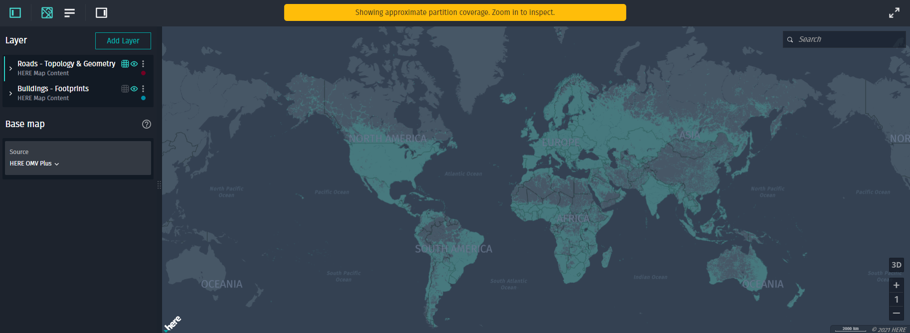 In the example below, we first visualized cartography data, then we selected the Roads - Topology & Geometry layer and clicked the same tile, and did similarly for Buildings - Footprints: