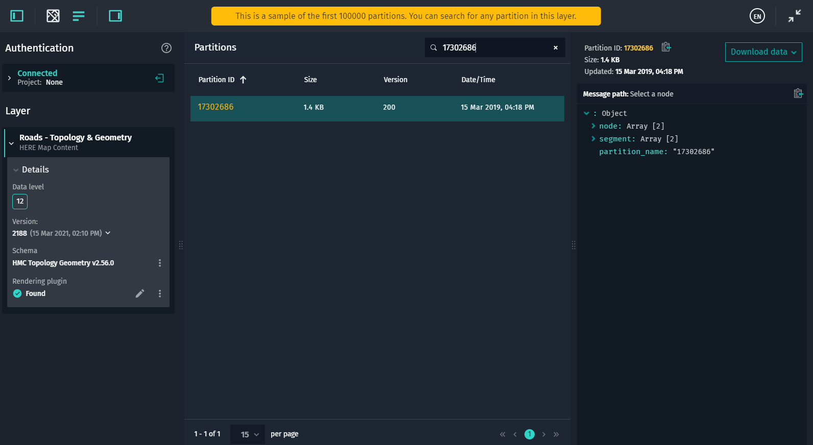 Due to performance considerations, the Partitions List panel shows a limited number of partitions - 100,000 for versioned layers and 10,000 for volatile layers. Nevertheless, you can still find any partition by its ID in the layer with no limitation.