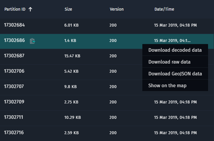- In the list: With the Partitions List panel, you can view a paginated list of any layer partitions, including those that can be neither decoded (no data schema bundled with the layer) nor visualized (no rendering plugin, generic partitions).