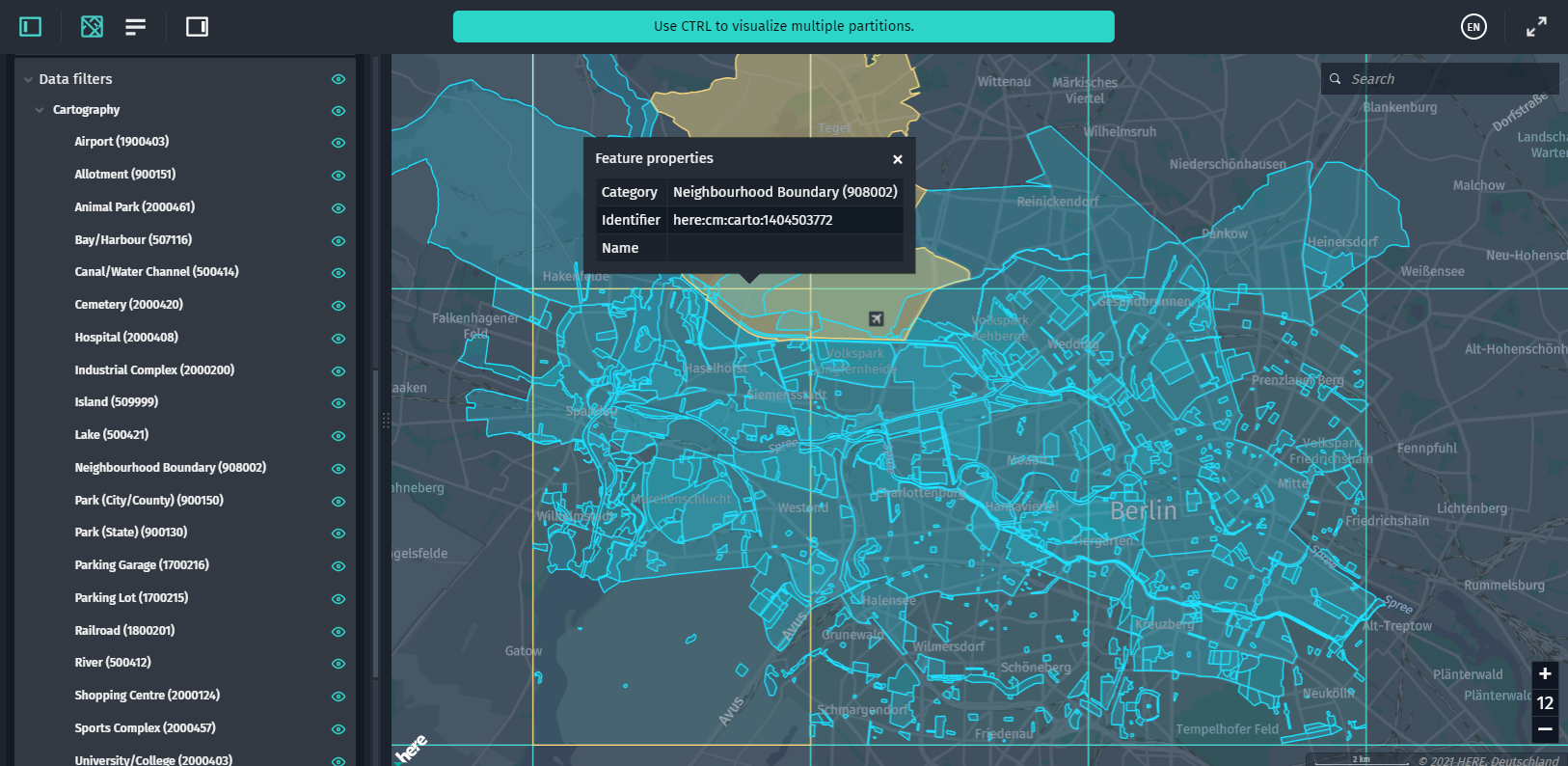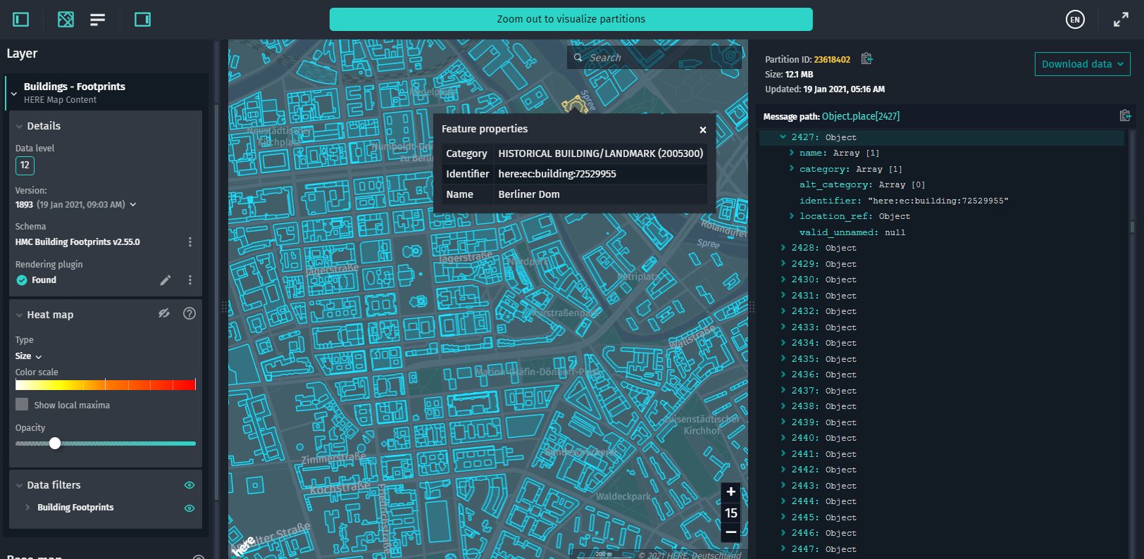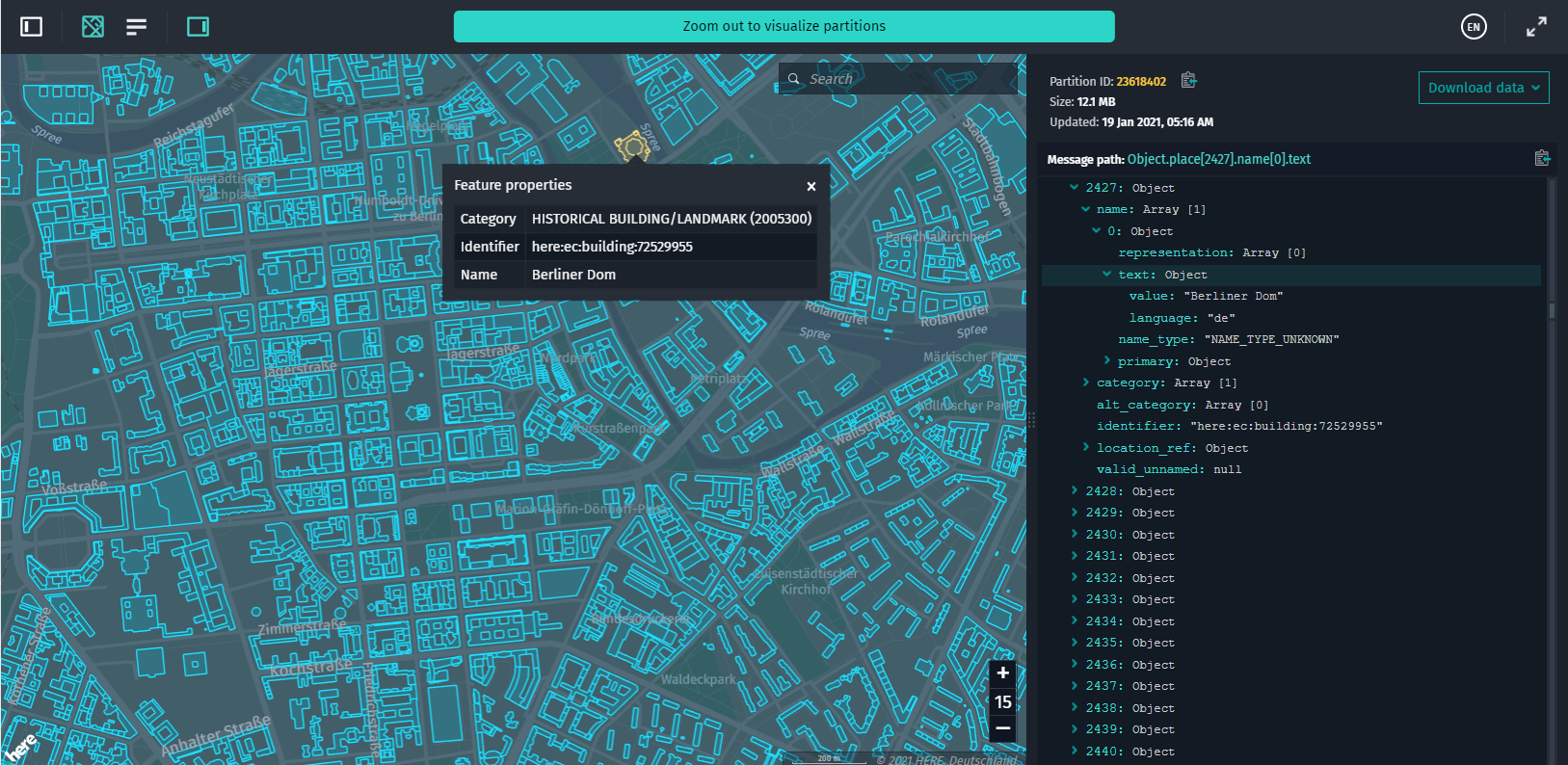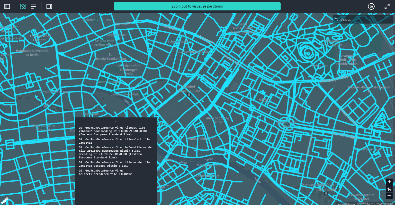 DecodedPanel: A UI widget that allows displaying decoded partition data, partition ID, partition size, and the timestamp of the last update of the data contained in a selected partition(s) (for versioned layers only). This widget also displays the Download data button. For a selected partition, this button allows downloading raw data, data decoded with the linked Protobuf schema, and GeoJSON data translated with the rendering plugin.Any errors that may occur during the partition data decoding process are also displayed in this panel.